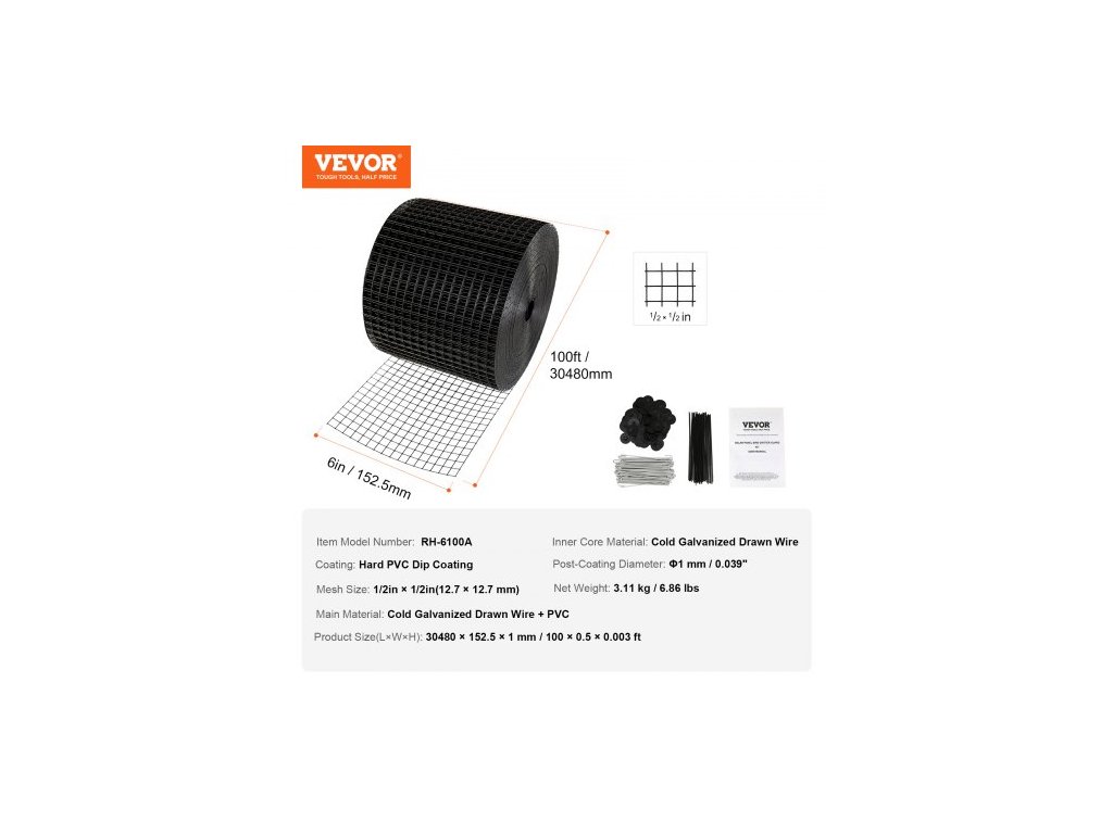 Materiál vnitřního jádra: Za studena pozinkovaný tažený drát,Průměr po povlakování: ?1 mm/0,039",Číslo modelu položky: RH-6100A,Rozměry produktu (DxŠxV): 30480×152,5×1 mm/100×0,5×0,003 ft,Povlak: Tvrdý PVC ponorný povlak,Čistá hmotnost: 3,11 kg/6,86 lbs,Velikost ok: 1/2"×1/2" (12,7×12,7 mm), hlavní materiál: za studena pozinkovaný tažený drát + PVC
