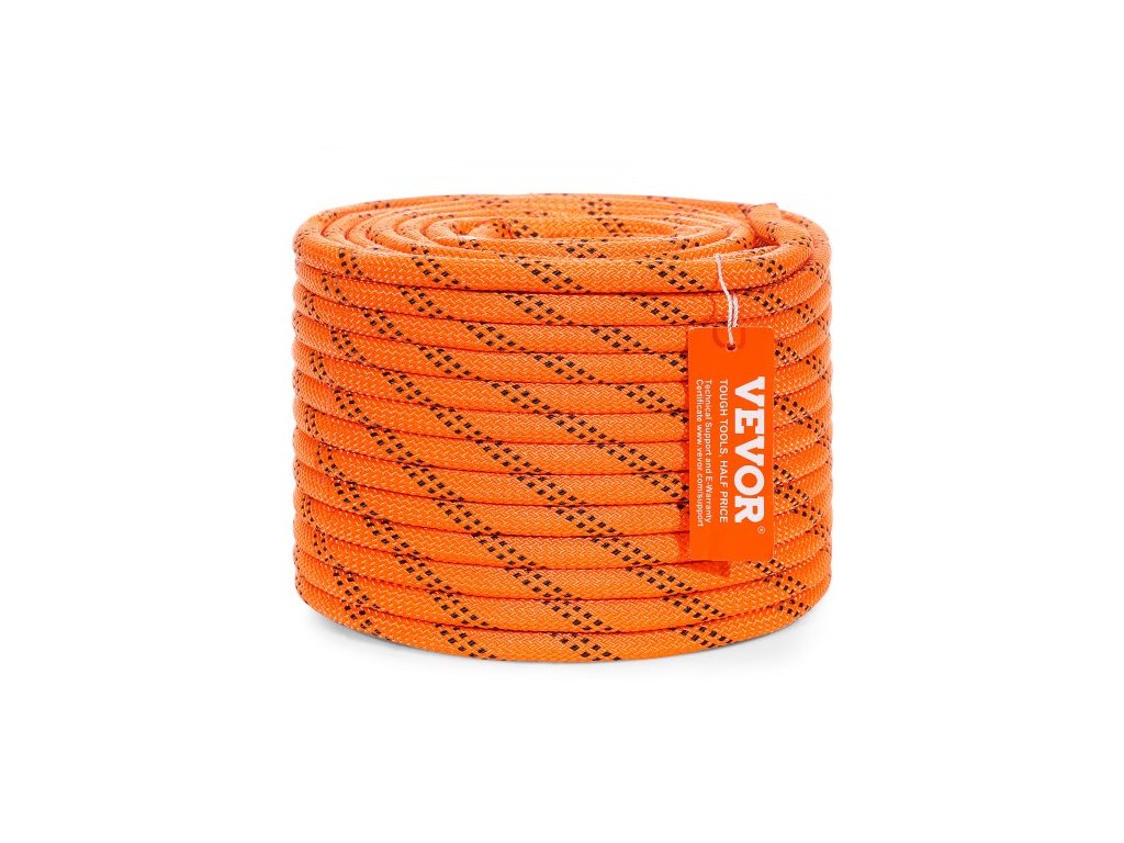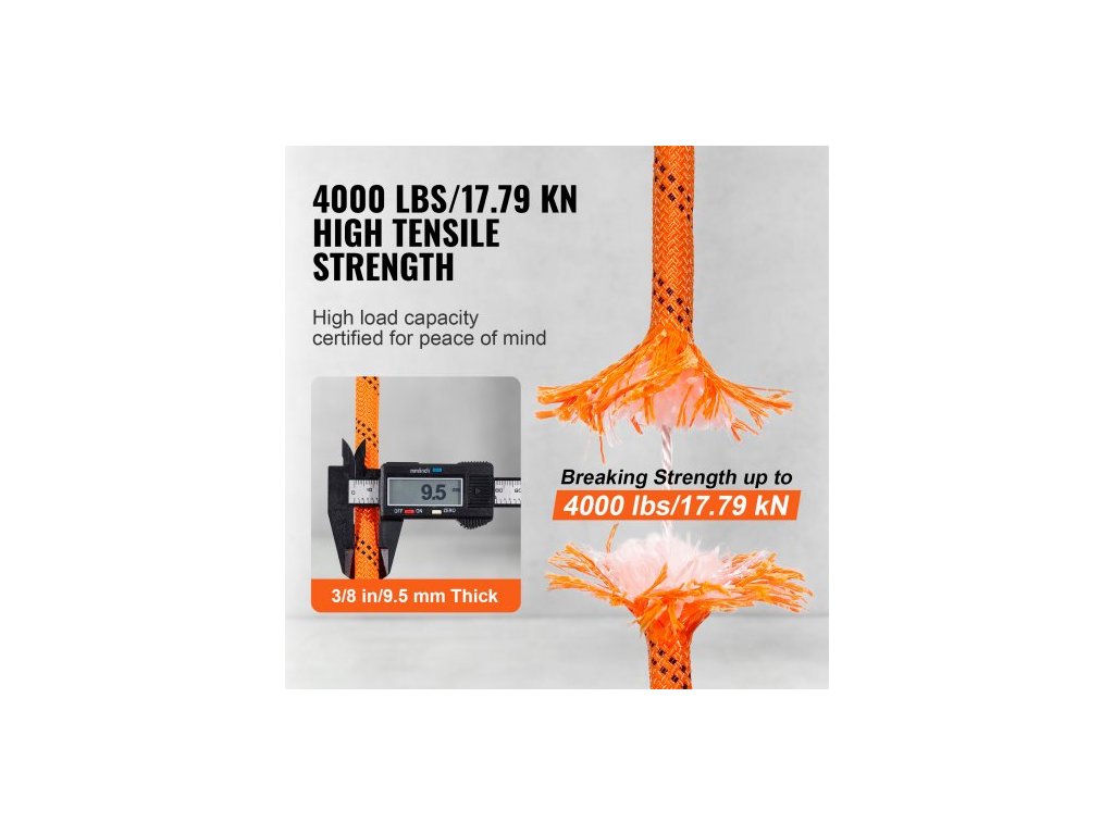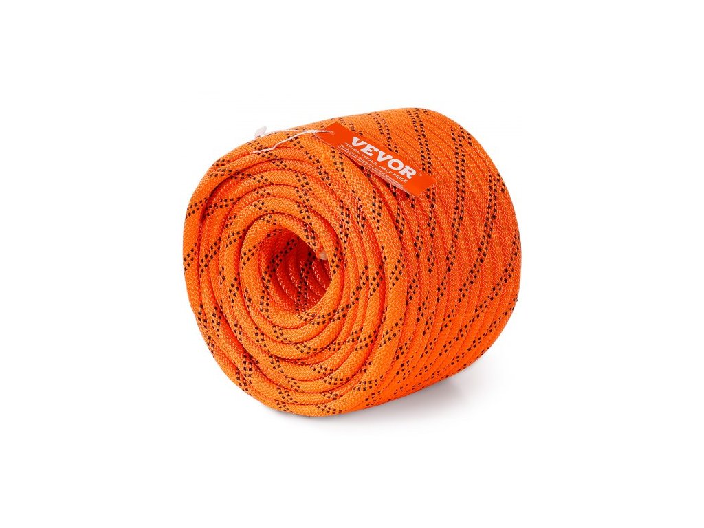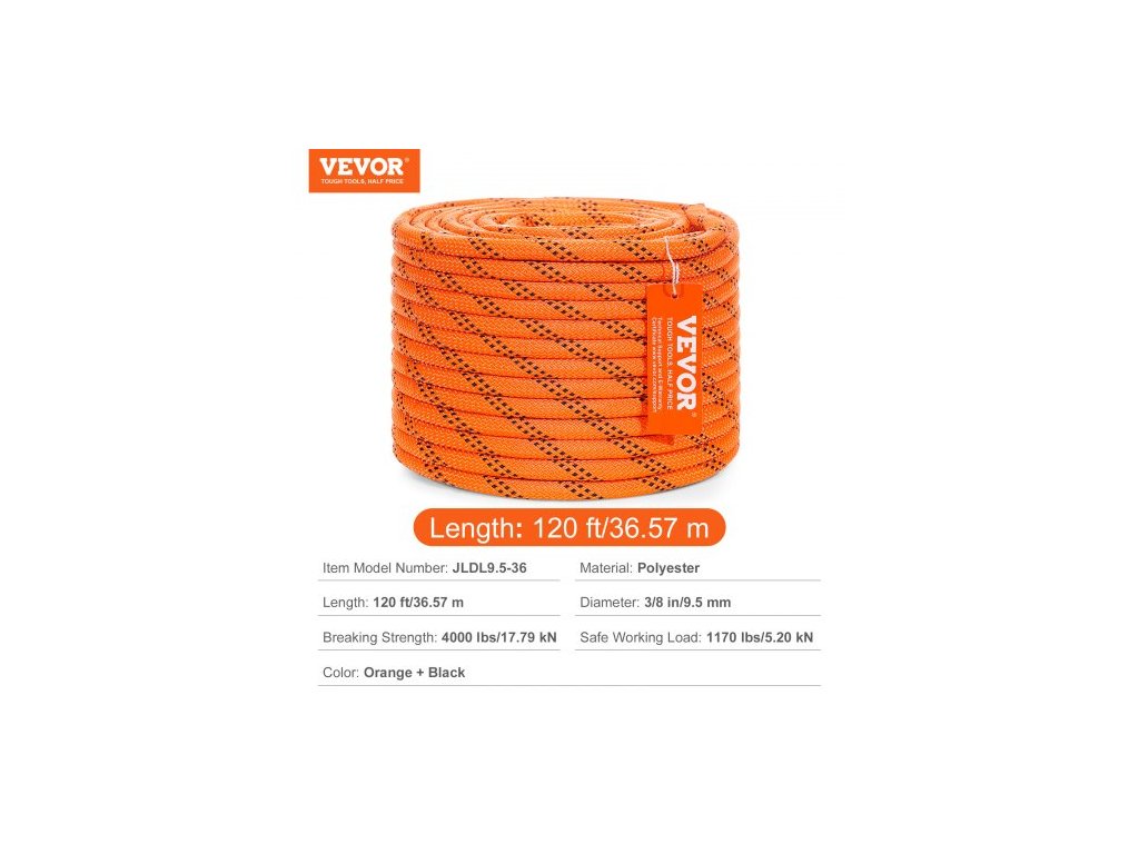 Délka: 120 stop/36,57 m, Pevnost v tahu: 4000 liber/17,79 kN, Barva: oranžová + černá, Číslo modelu položky: JLDL9.5-36, Bezpečné pracovní zatížení: 1170 liber/5,20 kN, Materiál: Polyester, Průměr: 3/8 palce/9,5 mm