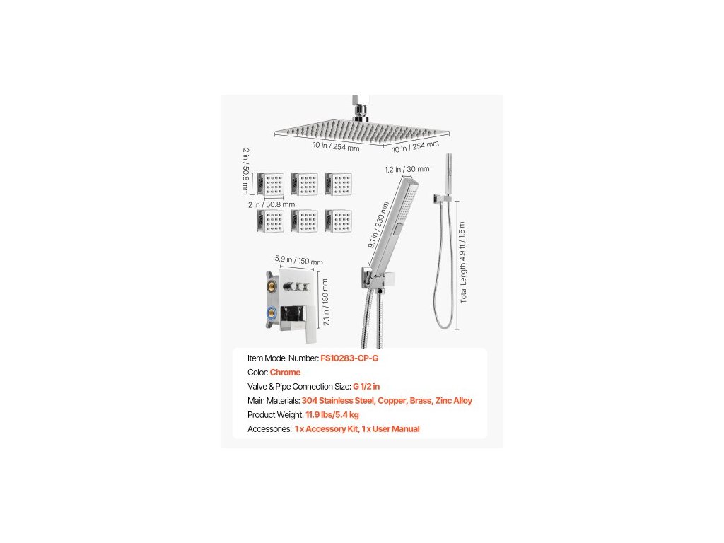 Hlavní materiály: nerezová ocel 304, měď, mosaz, slitina zinku, velikost připojení ventilu a potrubí: G 1/2 palce, barva: chrom, číslo modelu: FS10283-CP-G, hmotnost výrobku: 11,9 lbs/5,4 kg