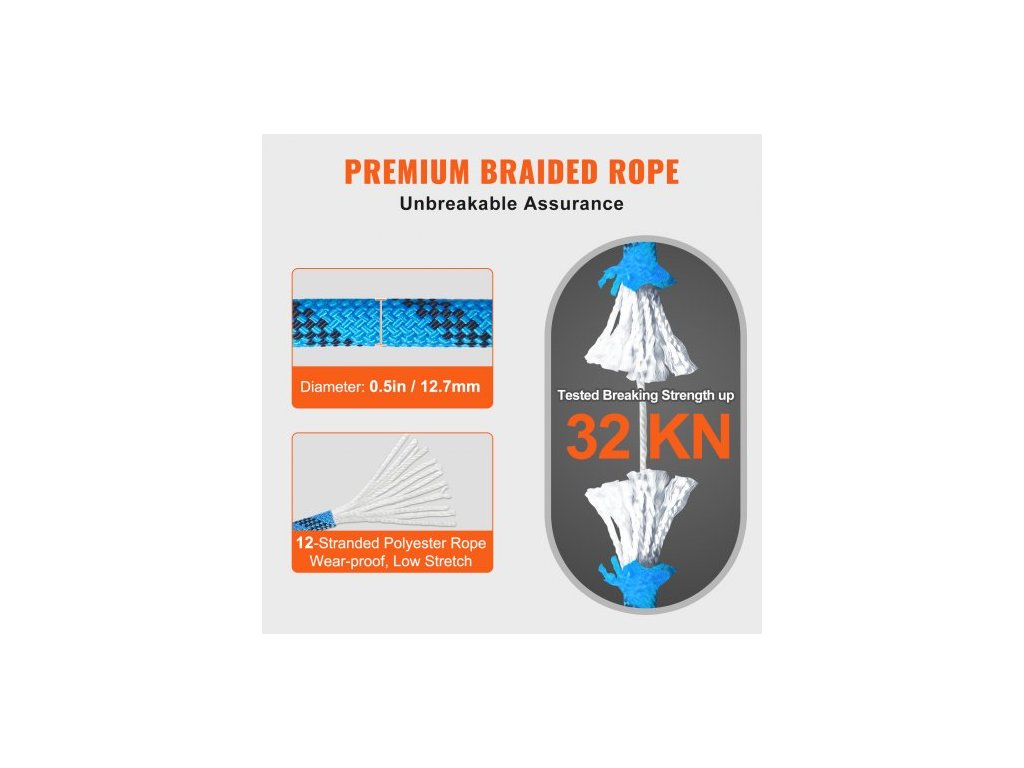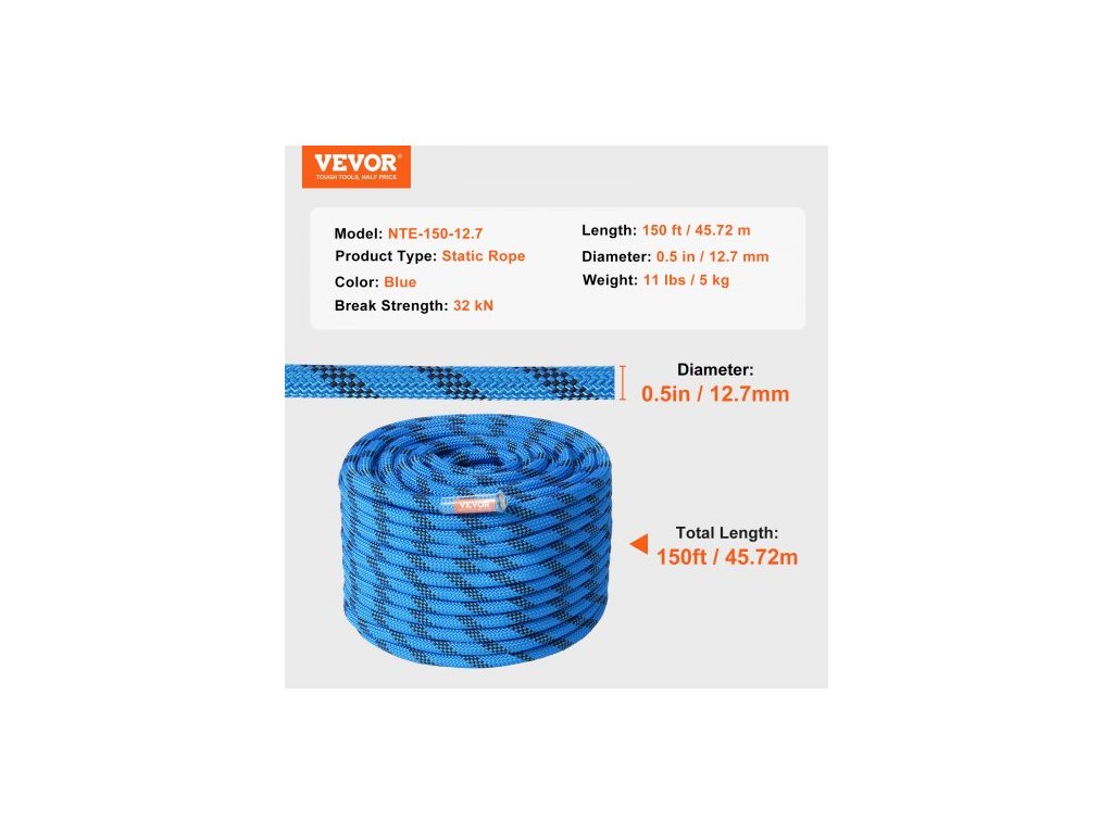 Typ produktu: Statické lano,Délka: 150 stop / 45,72 m,Pevnost v tahu: 32 kN,Barva: Modrá,Model: NTE-150-12,7,Průměr: 12,7 mm / 0,5 palce,Hmotnost: 5 kg / 11 liber