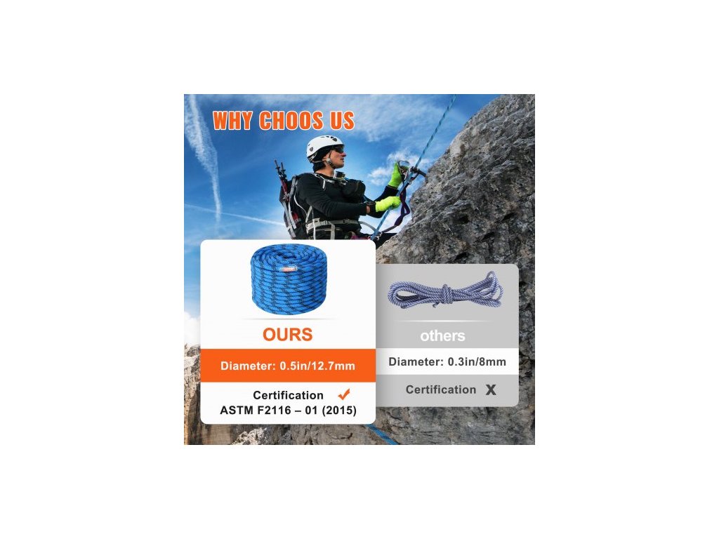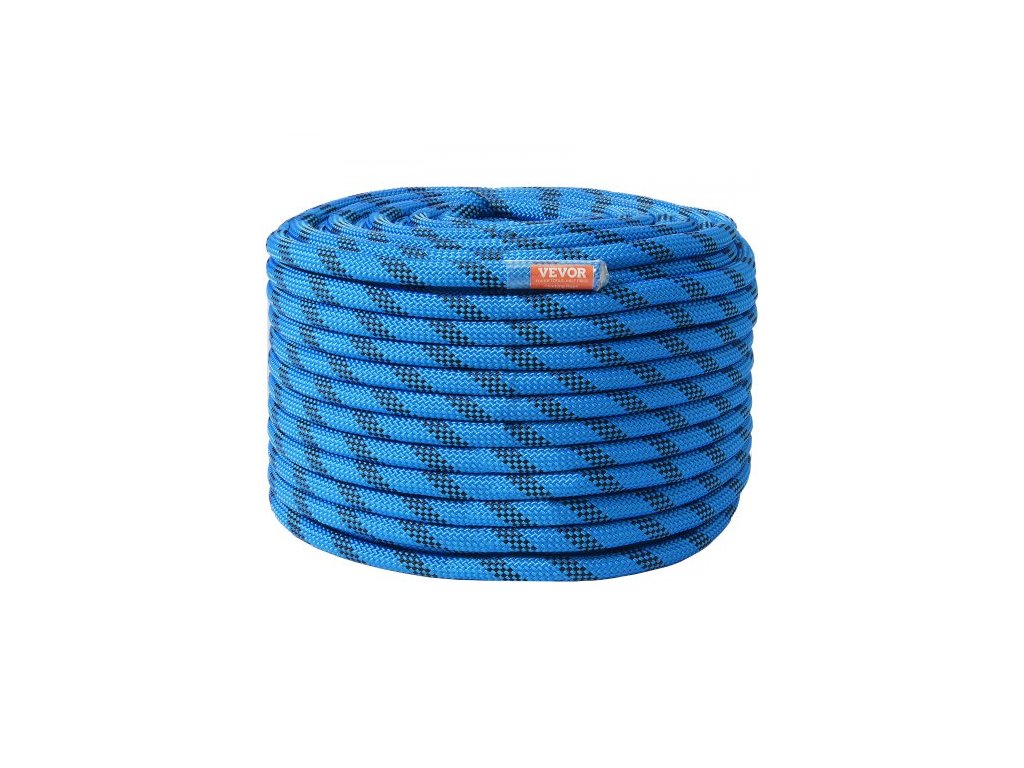 Statické lezecké lano 12,7 mm, 45,7 m (150 stop), venkovní lezecké lano, pevnost v tahu 30 kN, vláknité lano s ocelovými karabinami pro únik, slaňování a hasičskou záchranu, modré