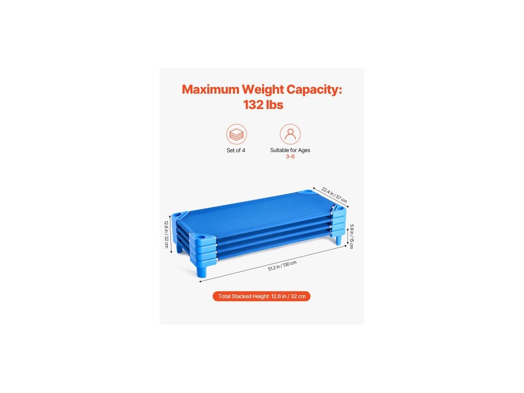 Rozměry látky: 51,2 x 22,4 palce / 130 x 57 cm, Nosnost: 132 lbs / 59,9 kg, Maximální stohovatelnost: 20 lůžek, Barva: Modrá, Číslo modelu položky: QL130-4, Sada obsahuje: 4 lůžka, Materiál: PP, pozinkovaná železná trubka, oxfordská tkanina, Čistá hmotnost sady: 24,9 lbs / 11,3 kg, Jednolůžko Rozměry postele: 51,2 x 22,4 x 5,9 palce / 130 x 57 x 15 cm