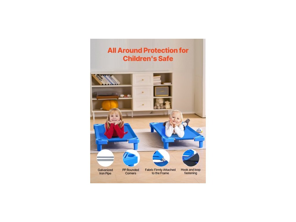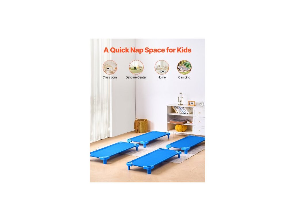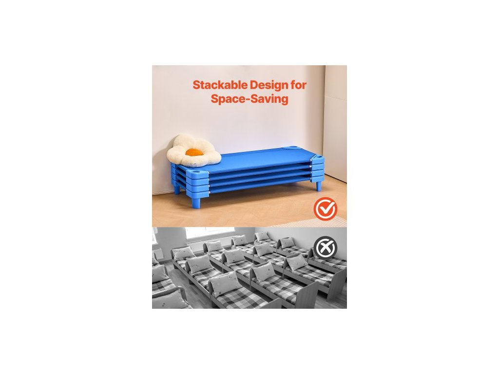 Stohovatelná dětská postýlka, balení po 4 kusech, přenosné postýlky pro batolata, standardní velikost 137 cm D x 67 cm Š, postýlky pro denní péči o děti, předškolní třída, postýlky pro denní péči o děti na spaní, odpočinek, zdřímnutí, modrá