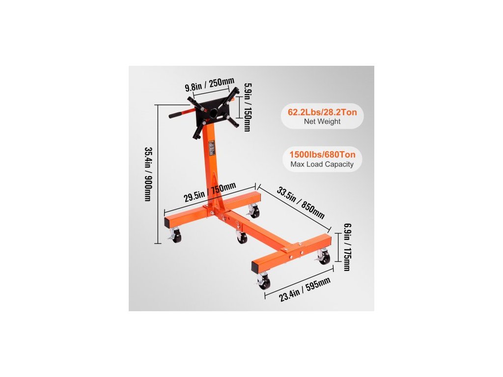 Délka rukojeti: 20"/508 mm,Max. nosnost: 1500 liber/680 kg,Materiál: Ocel,Rozměry výrobku: 29,5 × 33,5 × 35,4 palce/750 × 850 × 900 mm,Čistá hmotnost: 62,2 liber/28,2 kg