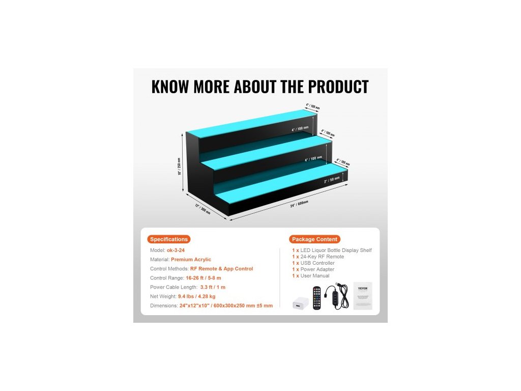 Délka napájecího kabelu: 1 m,Číslo modelu položky: ok-3-24,Rozměry: 600x300x250 mm ±5 mm,Materiál: Prémiový akryl,Způsoby ovládání: RF dálkové ovládání a ovládání aplikací,Dosah ovládání: 5-8 m,Čistá hmotnost: 4,28 kg