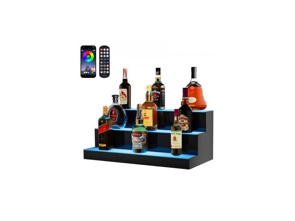 Stojan na lahve s alkoholem s LED osvětlením, 3 úrovně, 24palcový komerční osvětlený domácí barový regál, 3stupňový stojan na whisky, akrylové police na nápoje s RF dálkovým ovládáním a ovládáním pomocí aplikace a vícebarevné osvětlení.