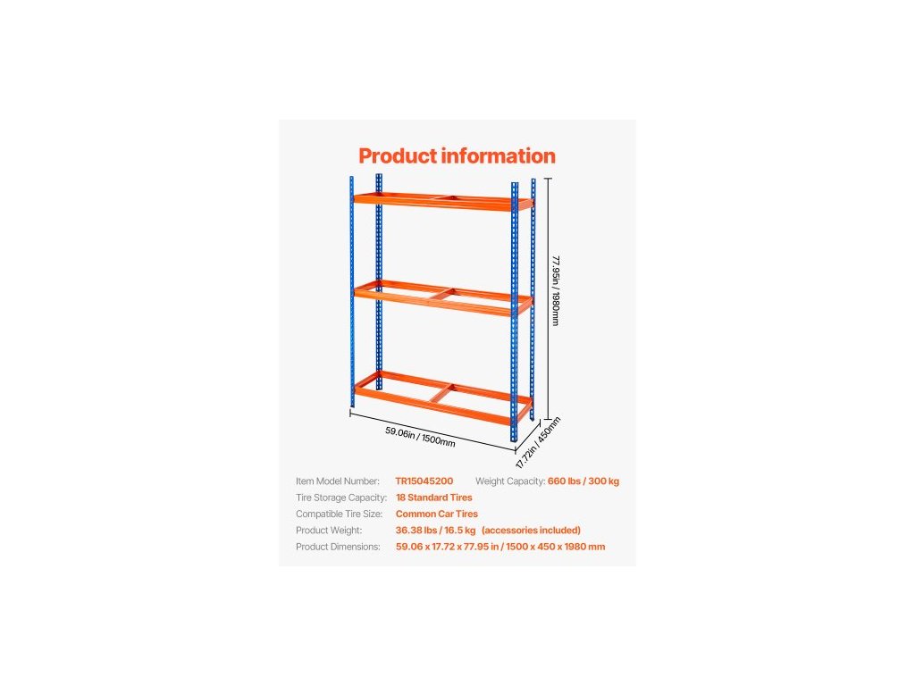 Kompatibilní velikost pneumatik: Běžné automobilové pneumatiky, Nosnost: 660 liber / 300 kg, Číslo modelu položky: TR15045200, Kapacita skladování pneumatik: 18 standardních pneumatik, Hmotnost výrobku: 36,38 liber / 16,5 kg (včetně příslušenství), Rozměry výrobku: 59,06 x 17,72 x 77,95 palce (cca 1500 x 450 x 1980 mm)