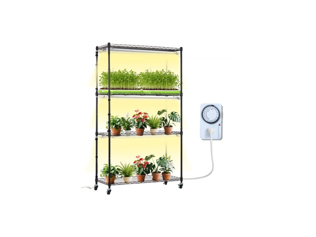 Stojan na rostliny s pěstebním světlem, 4 úrovně, 180W vnitřní pěstební světlo, 3 režimy spektra světla, kovová police na rostliny s časovačem, zahradní pěstební stojan pro setí, 91,5 cm D x 33,8 cm Š x 147,1 cm V