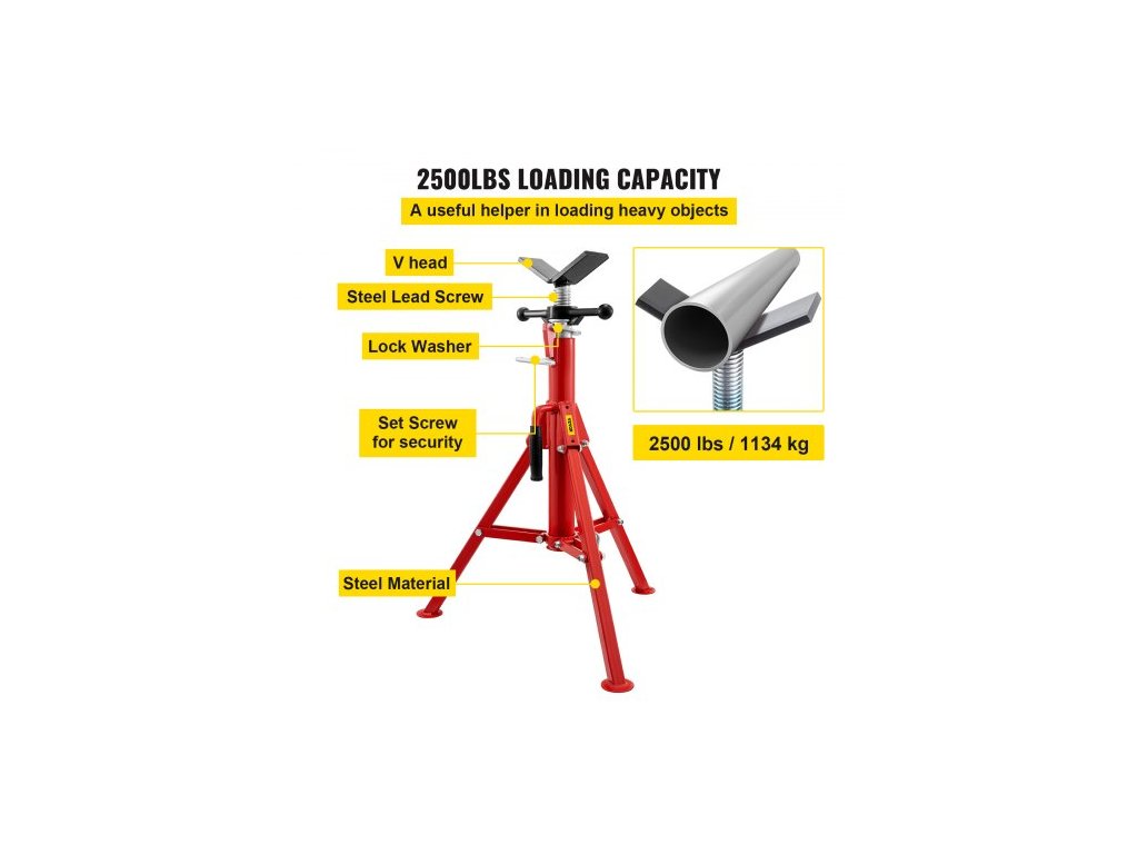 Nosnost: 2500 liber/1134 kg,Model: 1107S hlava ve tvaru V,Kapacita trubky: 1/8"–12",Materiál: Ocel,Typ hlavy: hlava ve tvaru V,Výška: 28–52 palců/71–132 cm