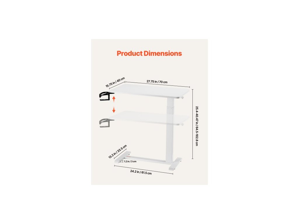 Rozsah úhlu naklopení: 0-60°,Hlavní materiály: Deska stolu: dřevotříska; Rám: lakovaná legovaná ocel,Nosnost: V blízkosti sloupku: 66 lbs / 30 kg; Okraj stolu: 10 kg, Typ produktu: Dřevěná základna, Výška základny: 30 mm, Barva: Bílá, Číslo modelu položky: GT-SR65-B6, Zvedací/naklápěcí mechanismus: Hydraulický, Rozměry produktu: 70 x 40 x 64,5–102,8 cm, Čistá hmotnost: 8,2 kg, Konstrukce desky stolu: Plochý talíř s držákem na nápoje
