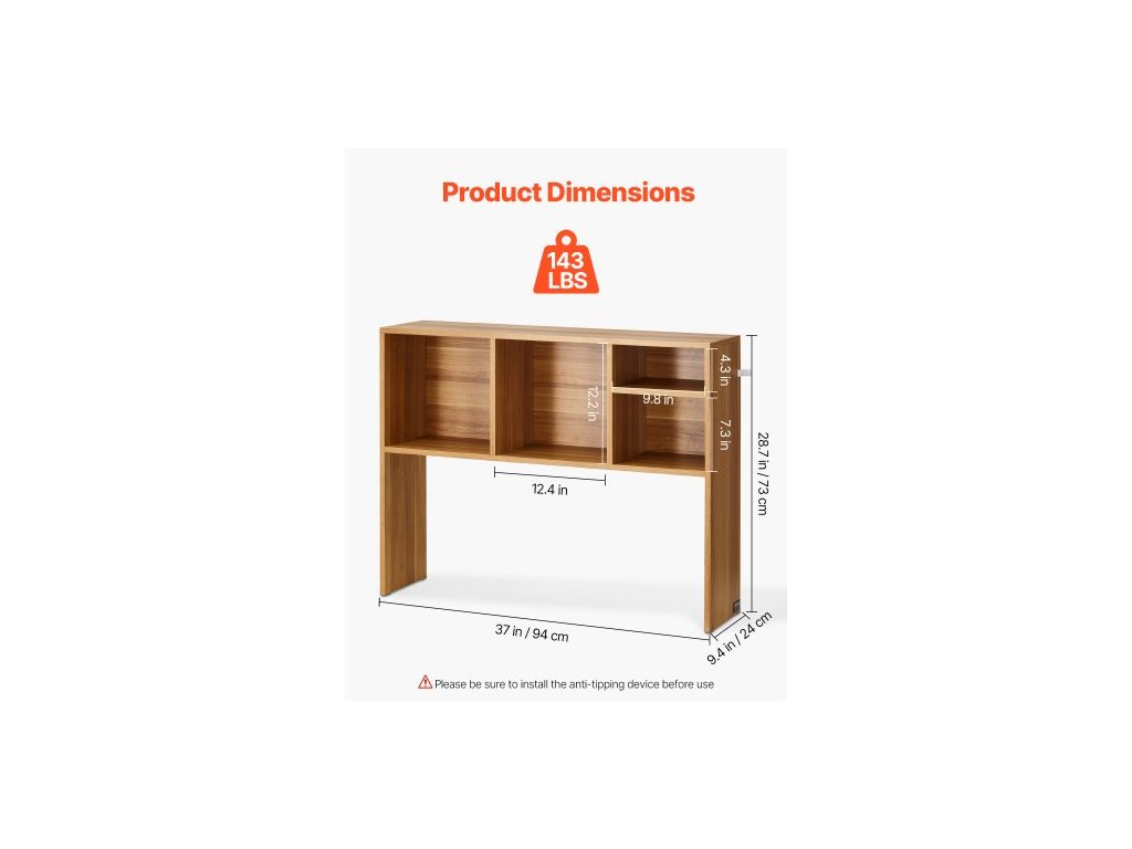 12,4 x 12,2" / 31,5 x 31 cm:,Tloušťka zadního panelu: 3 mm,Barva: Barva dřeva,9,8 x 4,3" / 24,9 x 10,9 cm:,Tloušťka desky police: 15 mm,Rozměry výrobku: 94 x 24 x 73 cm Police: 1,Další podrobnosti:Nosnost: 65 kg,Rozměry police:Protiskluzové nožičky:Číslo modelu: KLBS-03,Příslušenství proti převrácení:Čistá hmotnost: 11,05 kg,Hlavní materiál: Dřevotříska + melaminový papír,24,9 x 18,5 cm