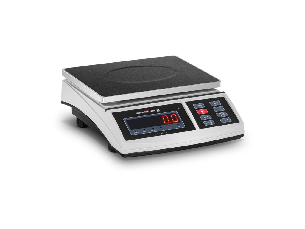 Stolní váha s LED displejem a výkonnou bateriíStolní váha SBS-TW-15 stanovuje přesné výsledky vážení, které si snadno přečtete na LED displeji na přední straně. Váha je určena pro zatížení až 15 kg s přesností 0,5 g. Ideálně se hodí pro stanovení přesné hmotnosti přísad, poštovních listin, šroubků a mnoha dalších věcí. Váha je předem kalibrována, takže je připravena k okamžitému použití.Stolní váha značky Steinberg Systems pro přesné váženíDigitální váha je pro rychlé a jednoznačné zobrazení hmotnosti vybavena kvalitním LED displejem. Díky 25 vysokým číslicím na displeji lze výsledky měření pohodlně odečítat i za špatných světelných podmínek0. Symbol alarmu varuje před přetížením váhy.Tato stolní váha má různé, praktické funkce. Kromě jednotky vážení si můžete vybrat mezi funkcemi počítání, procentuálního výpočtu, tárování a nulování. Ovládání tlačítky je velmi snadné. Digitální stolní váha disponuje rozhraním RS232 pro připojení k pokladně nebo počítači.Při návrhu této stolní váhy byl kladen velký důraz na kompaktní design. Vážicí plocha z ušlechtilé oceli o rozměrech 21 x 27 poskytne dostatek místa pro všechno běžné zboží. Výšku nožiček lze upravit, čímž můžete za pomoci zabudované vodováhy optimálně vyrovnat váhu na nerovném povrchu. Pro zajištění dlouhého provozu byla váha vybavena akumulátorem 6 V 4 Ah. Ten umožňuje mobilní provoz po dobu až 80 hodin. Digitální váha má režim úspory energie, který ji vypne po 3 s nečinnosti. Navíc si můžete stav baterie přečíst na displeji.