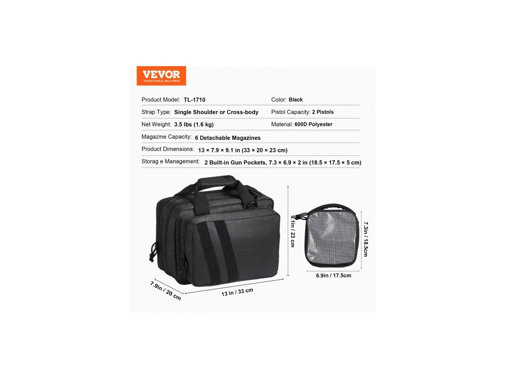 Kapacita zásobníků: 6 odnímatelných zásobníků,Typ popruhu: Přes rameno nebo přes rameno,Kapacita pistole: 2 pistole,Barva: Černá,Správa úložného prostoru: 2 vestavěné kapsy na zbraň, 7,3 × 6,9 × 2 palce (18,5 × 17,5 × 5 cm),Model produktu: TL-1710,Materiál: 600D Polyester,Rozměry produktu: 13 × 7,9 × 9,1 palce (33 × 20 × 23 cm),Velikost popruhu: 1,5 × 55,1 palce (3,8 × 140 cm), Čistá hmotnost: 3,5 libry (1,6 kg)