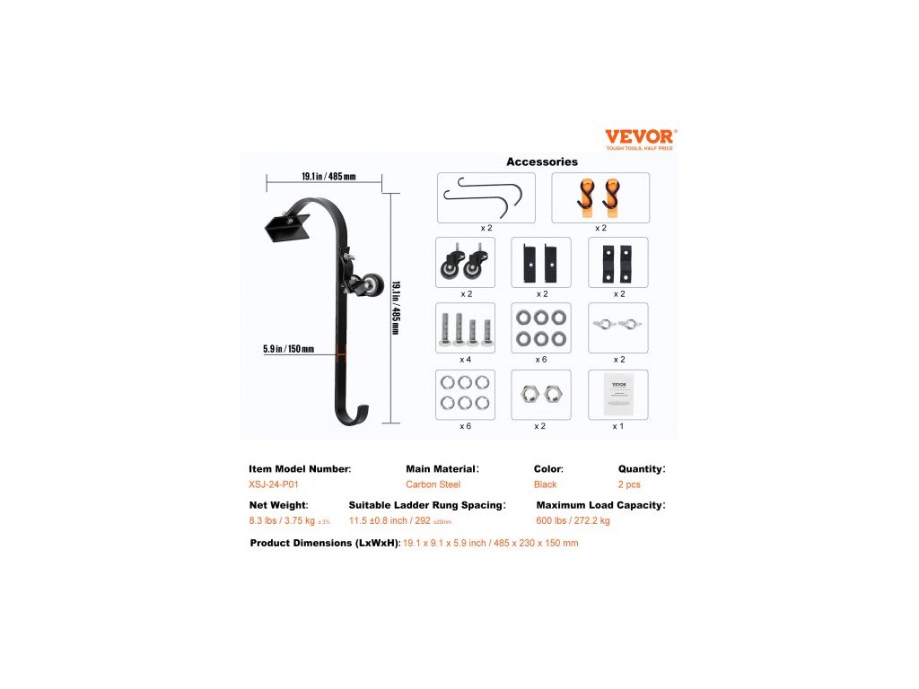 Rozměry výrobku (DxŠxV): 19,1 x 9,1 x 5,9 palce / 485 x 230 x 150 mm,Barva: Černá,Vhodná rozteč příček žebříku: 11,5 ±0,8 palce / 292 ±20 mm,Model: XSJ-24-P01,Maximální nosnost: 600 liber / 272,2 kg,Množství: 2 ks,Čistá hmotnost: 8,3 liber / 3,75 kg ± 3 %, hlavní materiál: uhlíková ocel