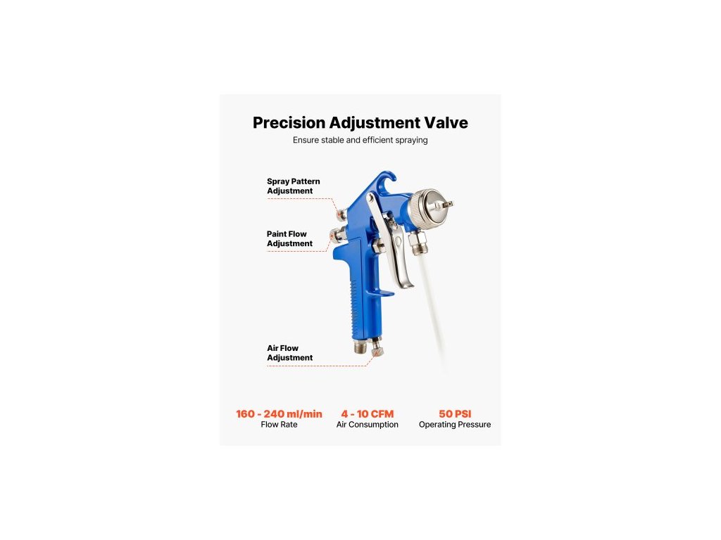 Provozní tlak: 50 PSI, Průtok barvy: 160 - 240 ml/min, Nastavení průtoku barvy: Ano, Velikost vstupu vzduchu: 1/4" NPT, Kapacita nádobky na barvu: 0,26 galonu / 1000 ml, Rozměry produktu: 11,61 x 7,28 x 4,33 palce / 295 x 185 x 110 mm, Velikost trysky: 1,8 mm, Spotřeba vzduchu: 4 -10 CFM, Typ produktu: Stříkací pistole s přívodem sifonu, počet trysek: 1, číslo modelu položky: 4001, hmotnost netto: 0,9 kg, hlavní materiál: nerezová ocel a mosaz