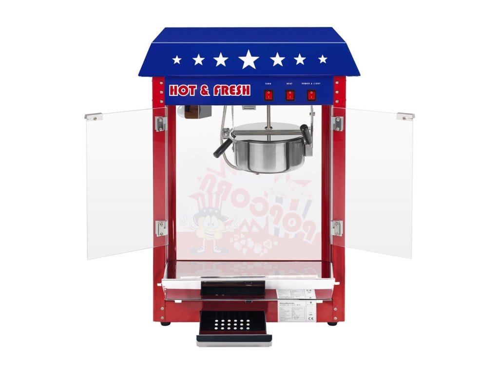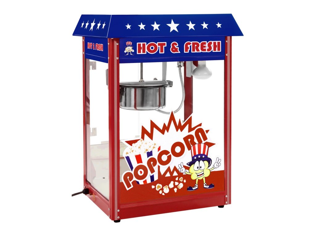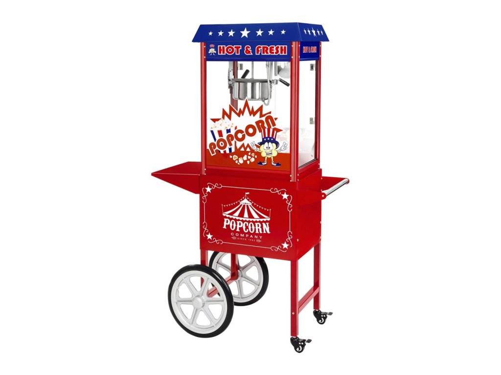 Stroj na popcorn RCPW-16.1 od RC je vhodný na profesionální použití na slavnostech, firemních akcích či trzích a dalších akcích. Vedle vyhřívané základové desky a výkonného topného elementu s 1600 watty okouzlí zejména jedinečným USA designem a červeným vozíkem. Stroj na popcorn je vyroben z vysoce kvalitního, potaženého nerez a lze ho snadno čistit. Vytížení zařízení je 16 litrů popcornu za hodinu (cca 5 kg popcornu za hodinu). Servírovací příklop na stranách vozíku zajišťuje obzvláště snadné odstranění a porcování popcornu. Na spodní straně stroje se také nachází úložný prostor navíc, ve kterém může být hotový popcorn odložený. Odnímatelný hrnec z nerez má průměr 18,5 cm. Díky teflonové vrstvě je zabráněno spálení popcornu. K tomu se ještě snadno čistí a dá se tak rychle znovu použít. Díky atraktivnímu americkému designu a ozdobné nálepce upoutá tento stroj pozornost.Při koupi stroje na popcorn RCPW-16.1 obdržíte zdarma sadu příslušenství skládající se z lopatky a odměrky. Praktická lopatka je ideální na naplnění odměrky, pytlíků nebo samotného stroje na popcorn. Odměrka má objem 0,5 litru a pomáhá při odměřování oleje, cukru nebo kukuřičných zrn.