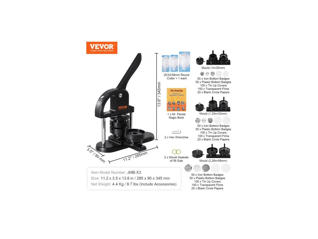 Průměr raznice: 0,98/1,25/2,28 palce (25/32/58 mm),Rozměry: 11,2 x 3,5 x 13,6 palce / 28,5 x 9 x 34,5 cm,Barva: Černá + oranžová,Číslo modelu položky: JMB-X3,Materiál: Plast,Čistá hmotnost: 4,4 kg/9,7 lbs (včetně příslušenství)