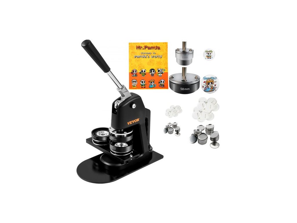 Obsahuje: stroj na odznaky, 300 ks příslušenství k odznakům o průměru 32 mm, 200 ks příslušenství k odznakům o průměru 58 mm, vykrajovátko na kruhy o průměru 32 mm, vykrajovátko na kruhy o průměru 58 mm, šestihranné klíče, kouzelnou knihu s panem Pandou a manuál.