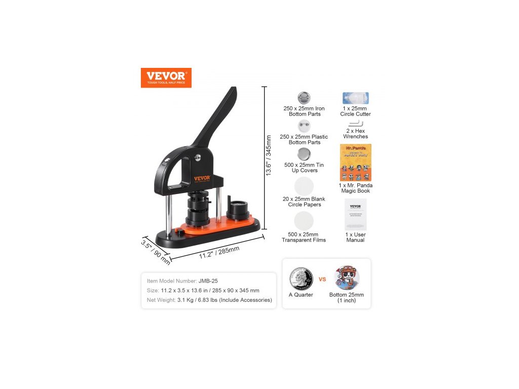 Průměr raznice: 0,98 palce / 25 mm,Rozměry: 11,2 x 3,5 x 13,6 palce / 28,5 x 9 x 34,5 cm,Barva: Černá + oranžová,Číslo modelu položky: JMB-25,Materiál: Plast,Čistá hmotnost: 3,1 kg / 6,83 lbs (včetně příslušenství)
