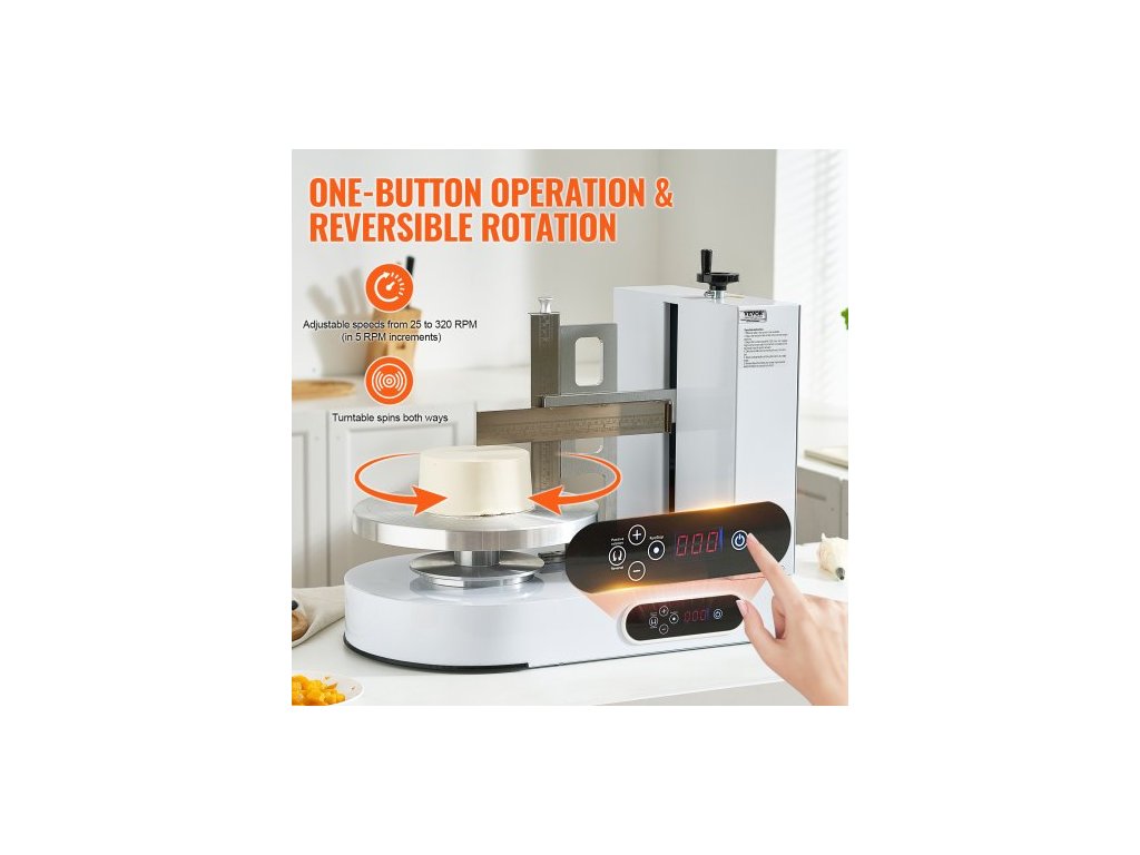 Stroj na zdobení dortů , stroj na roztírání a potahování dortového krému, tichý stroj na polevu dortů, otočný talíř s nastavitelnou škrabkou, pro dorty o průměru 15 až 35 cm, rychlost otáčení 25–320 ot./min, bílý