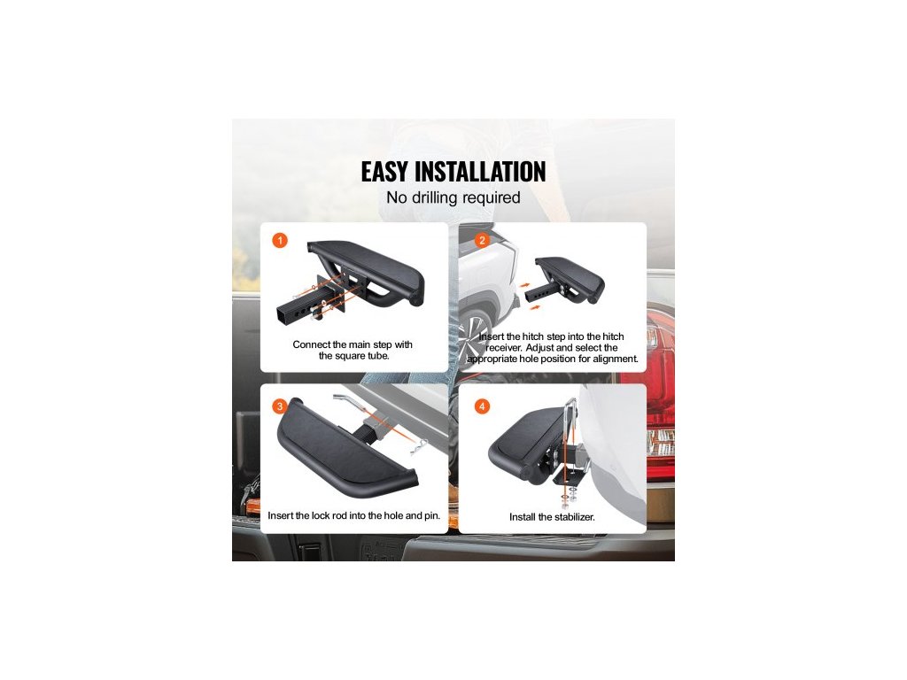 Stupeň pro tažné zařízení pro 2palcový držák, pevná ocelová konstrukce s nosností 350 liber, ochranný kryt zadního nárazníku s pojistným čepem a stabilizátorem, univerzální použití pro nákladní automobily, SUV, pickupy a přívěsy