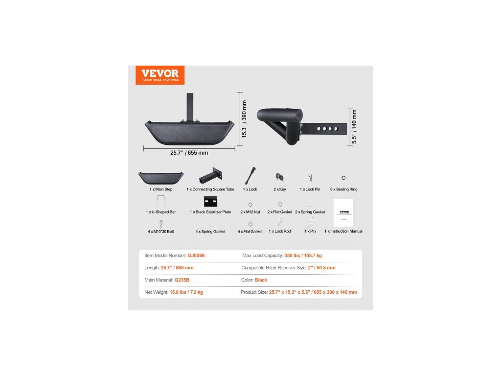 Délka: 25,7 palce / 655 ± 3 mm,Barva: Černá,Číslo modelu položky: GJ0066,Maximální nosnost: 350 liber / 158,7 kg,Kompatibilní velikost držáku tažného zařízení: 2" / 50,8 mm,Čistá hmotnost: 15,8 liber / 7,2 kg,Hlavní materiál: Q235B,Rozměry výrobku: 25,7" x 15,3" x 5,5" / 655 x 390 x 140 mm
