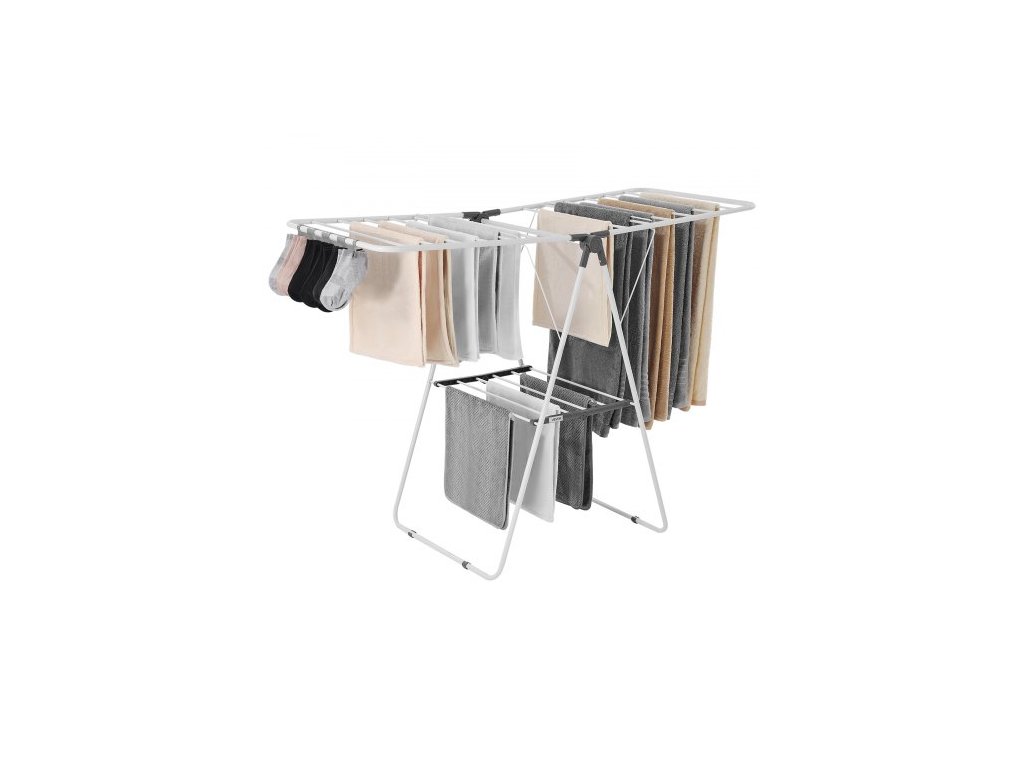Sušák na prádlo , 2patrový skládací sušák na prádlo s klipy na ponožky a 21 sušacími tyčemi, kovové výškově nastavitelné sušáky pro venkovní i vnitřní použití, volně stojící a prostorově úsporný věšák, bílý