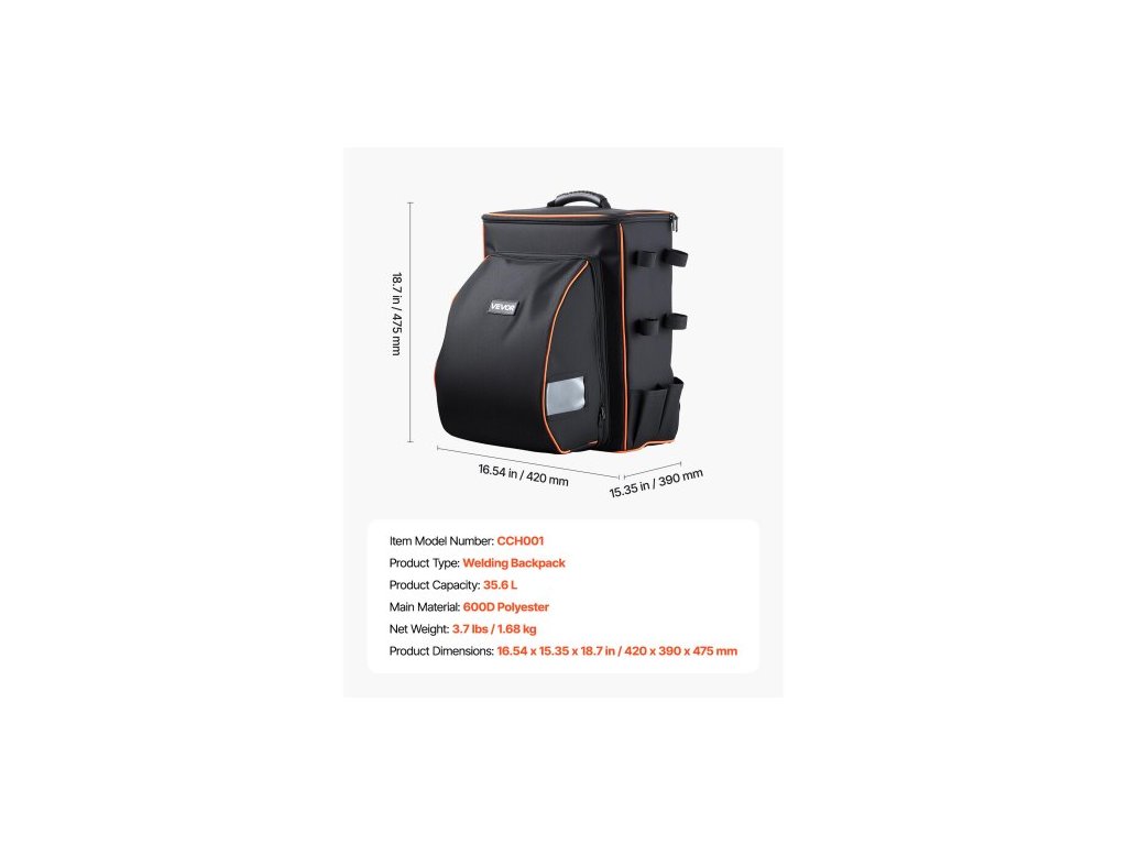 Objem produktu: 33,04 l,Typ produktu: Svářečský batoh,Číslo modelu položky: CCH005,Rozměry produktu: 14,17 x 8,27 x 18,7 palce / 360 x 210 x 475 mm,Čistá hmotnost: 2,87 lbs / 1,3 kg,Hlavní materiál: Polyester 600D