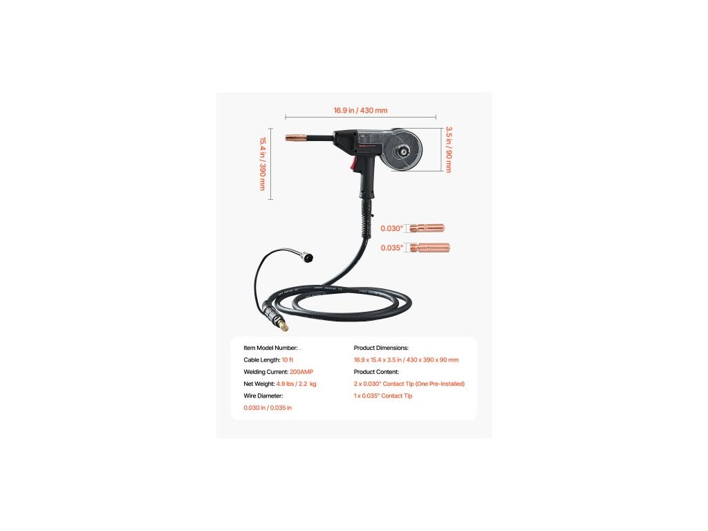 Číslo modelu položky: XLSP100T10,Délka kabelu: 10 stop,Rozměry výrobku: 16,9 x 15,4 x 3,5 palce / 430 x 390 x 90 mm,Čistá hmotnost: 4,9 lbs / 2,2 kg,Vhodný průměr drátu: 0,030"/0,035",Svařovací proud: 200AMP
