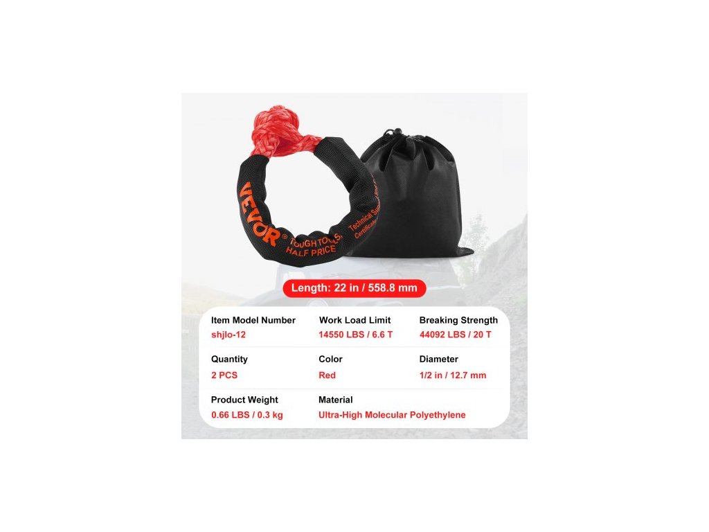 Pracovní zatížení: 14550 lbs/6,6T,Délka: 22 palců/558,8 mm,Mez pevnosti v tahu: 44092 lbs/20T,Barva: Červená,Číslo modelu položky: shjlo-12,Hmotnost výrobku: 0,66 lbs/0,3 kg,Množství: 2 ks,Materiál: Ultravysokomolekulární polyethylen,Průměr: 1/2 palce/12,7 mm