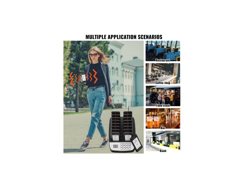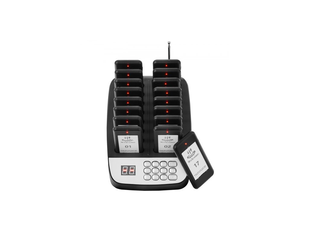 Systém pageru pro restaurace , bezdrátový signál pro čekající ve frontě s dosahem 500 m, bzučáky pro volání hostů s vibracemi a blikáním, 16 bzučáků pro pojízdné občerstvení, kostely, školky, nemocnice