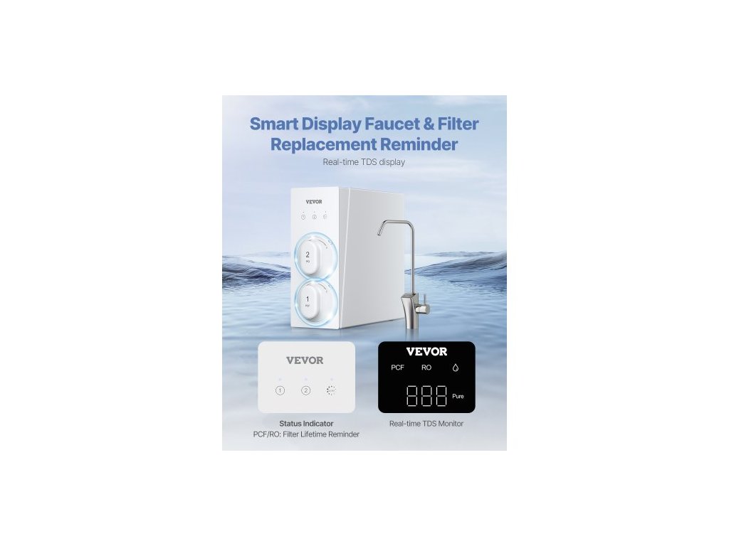 Systém reverzní osmózy , 8stupňový beztlakový filtr s reverzní osmózou o výkonu 800 GPD, redukce TDS certifikovaná NSF, systém filtrace vody pod dřezem s inteligentním displejem, poměr čistoty a odpadu 2:1