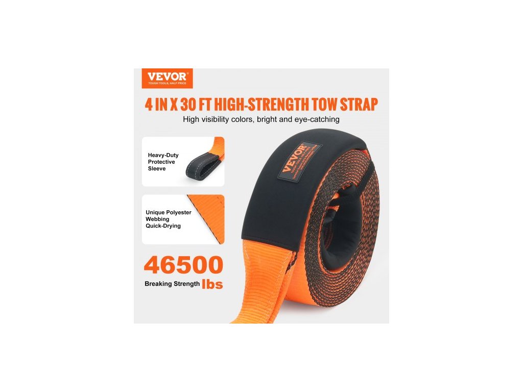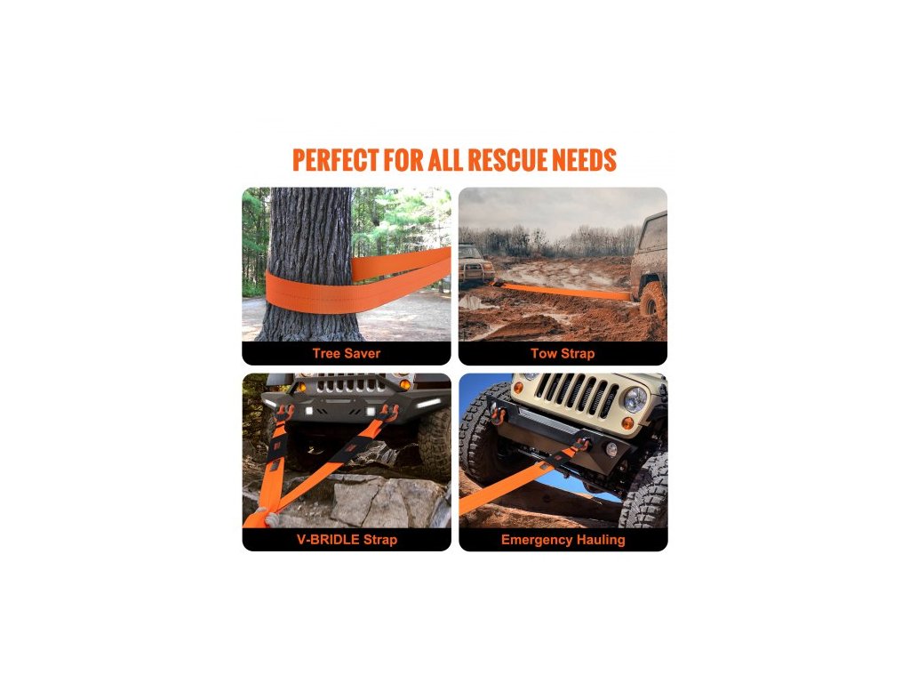 Tažný popruh pro odtah 4" x 30'/10,2 cm x 9,1 m, pevnost v tahu 46 500 lbs/21 099 kg, trojitě zesílené smyčkové popruhy, ochrana proti stromům, odtah a odtah v terénu, odolnost vůči extrémnímu počasí, ochranné návleky a úložný vak