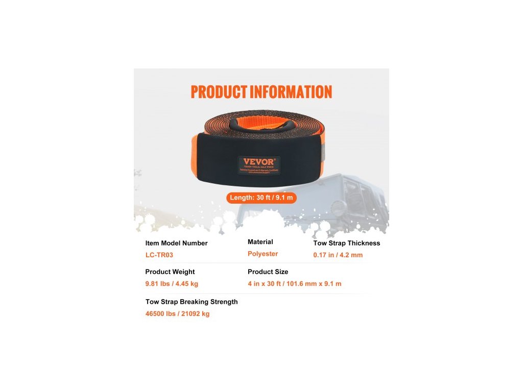 Tloušťka tažného popruhu: 0,17 palce/4,2 mm,Číslo modelu položky: LC-TR03,Hmotnost výrobku: 9,81 lbs/4,45 kg,Materiál: Polyester,Pevnost tažného popruhu: 46 500 lbs/21 092 kg,Rozměry výrobku: 4 palce x 30 ft/101,6 mm x 9,1 m