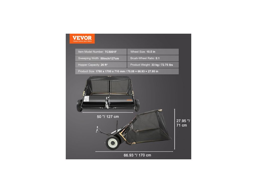 Šířka zametání: 50 palců/127 cm,Objem zásobníku: 26 ft3,Velikost kol: 10,5 palce/26,7 cm,Hlavní materiály: Železo, PP, PVC, Polyester,Poměr kartáče a kola: 5:1,Rozměry výrobku (D x Š x V): 70,07 x 66,93 x 27,95 palce/1780 x 1700 x 710 mm,Barva: Černá,Číslo modelu položky: TC5001F,Hmotnost výrobku: 72,75 lbs/33 kg,Materiál zásobníku: Nylon,Povrchová úprava: Lakování