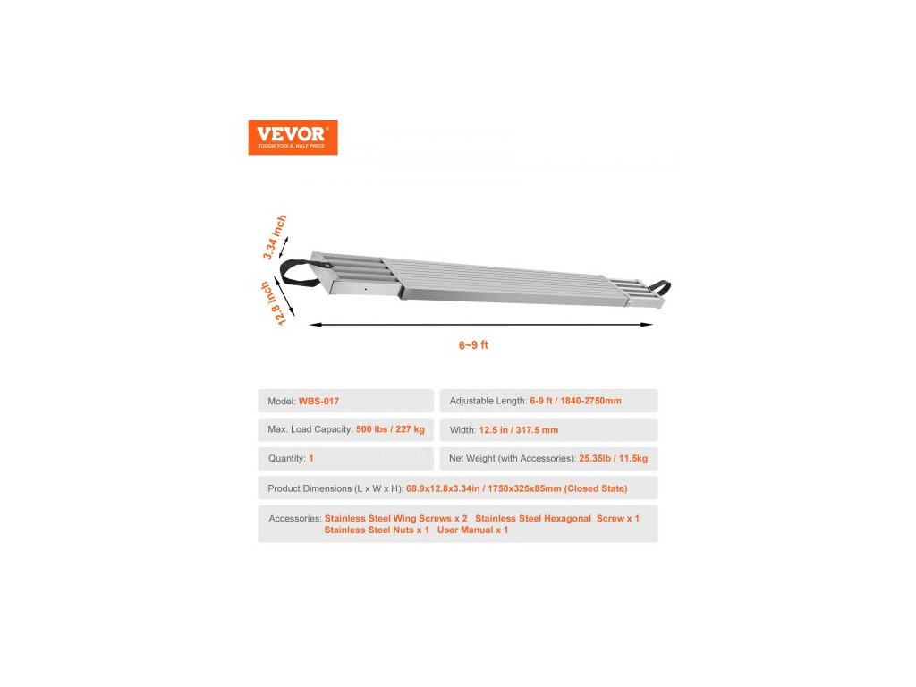 Model: WBS-017, Materiál: Hliníková slitina, Rozměry produktu (v zavřeném stavu): 1750 x 325 x 85 mm, Max. nosnost: 227 kg, Čistá hmotnost: 11,5 kg, Nastavitelná délka: 1840–2750 mm, Šířka položky: 317,5 mm