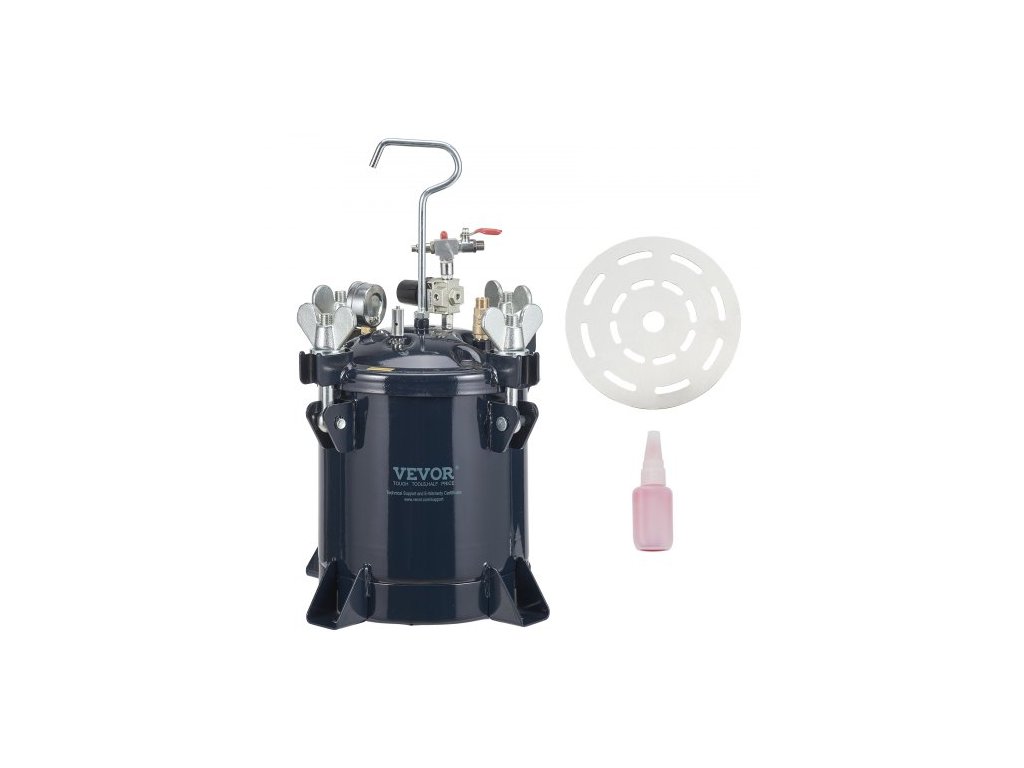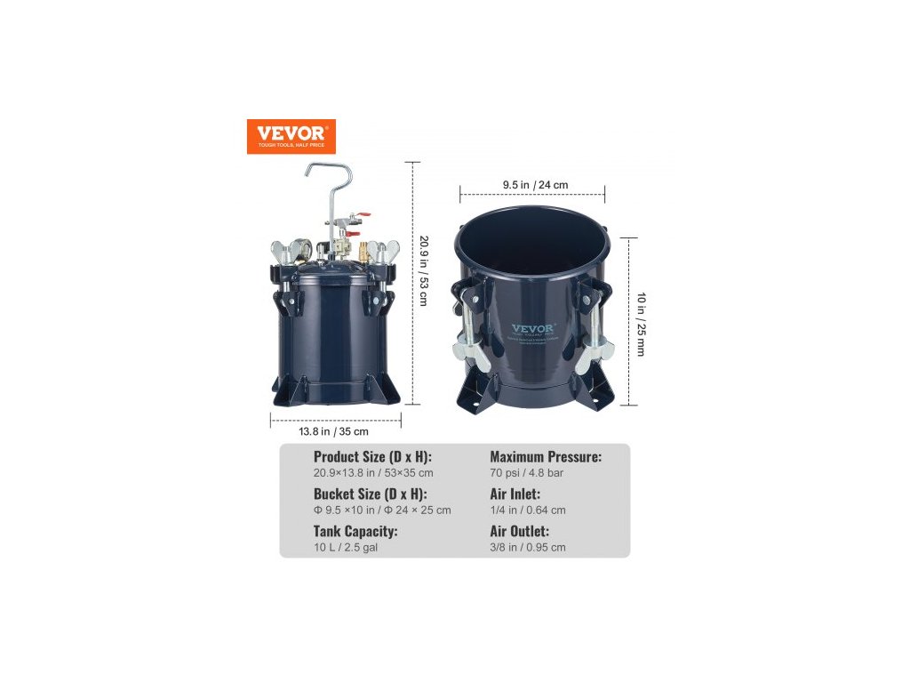 Tlaková nádoba má kapacitu 10l/2,5gal se vstupním a výstupním průměrem 1/4 palce a výstupním průměrem kapaliny 3/8 palce. Může pojmout více barevných nebo malých pryskyřičných modelů, což zefektivní vaši práci s lakováním.
