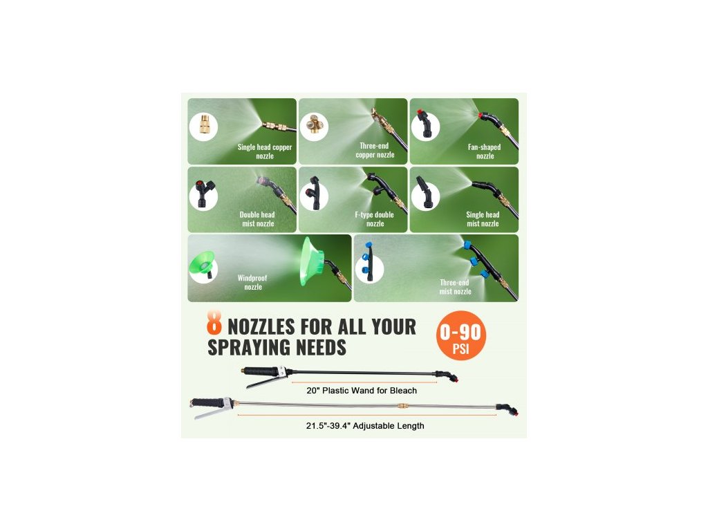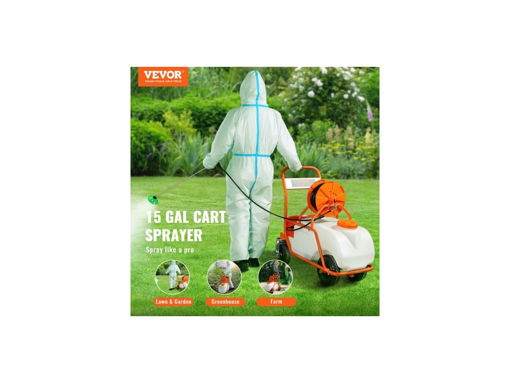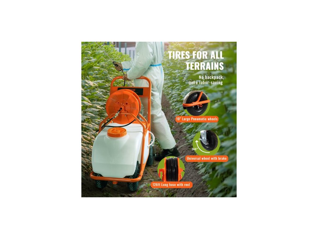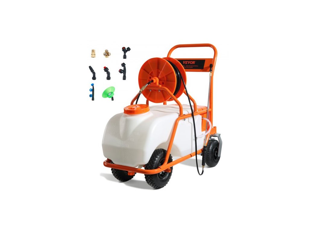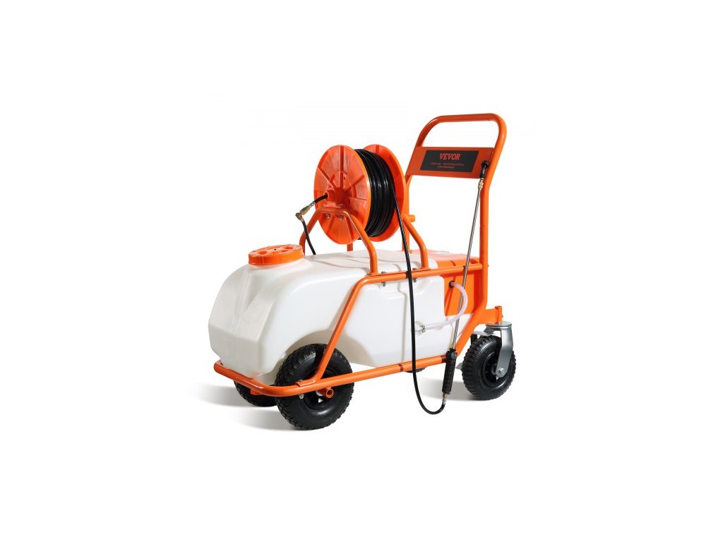 Trávníkový postřikovač s kolečky, nastavitelný tlak 0-90 PSI, postřikovač s nádrží o objemu 60 l, s 8 tryskami, 2 tyčemi, širokým otevíráním víka pro zahradu, odplevelování a postřik