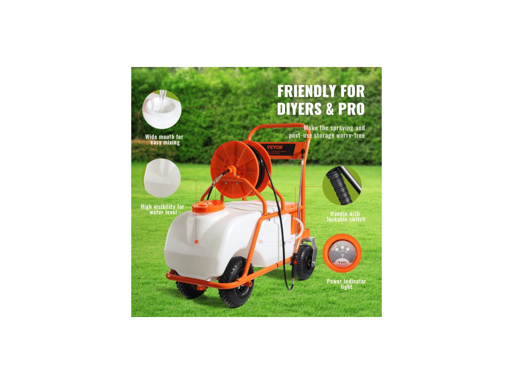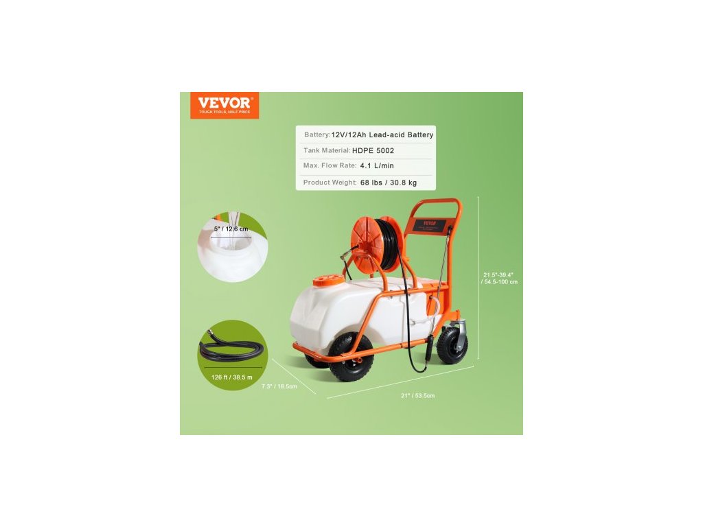 Rozměry produktu: 39 x 22 x 36,2 palce / 99 x 56 x 92 cm, Baterie: 12V/12Ah olověná baterie, Tlak: 0-90 PSI, Hmotnost produktu: 68 lbs / 30,8 kg, Materiál: HDPE 5002, Max. průtok: 4,1 l/min
