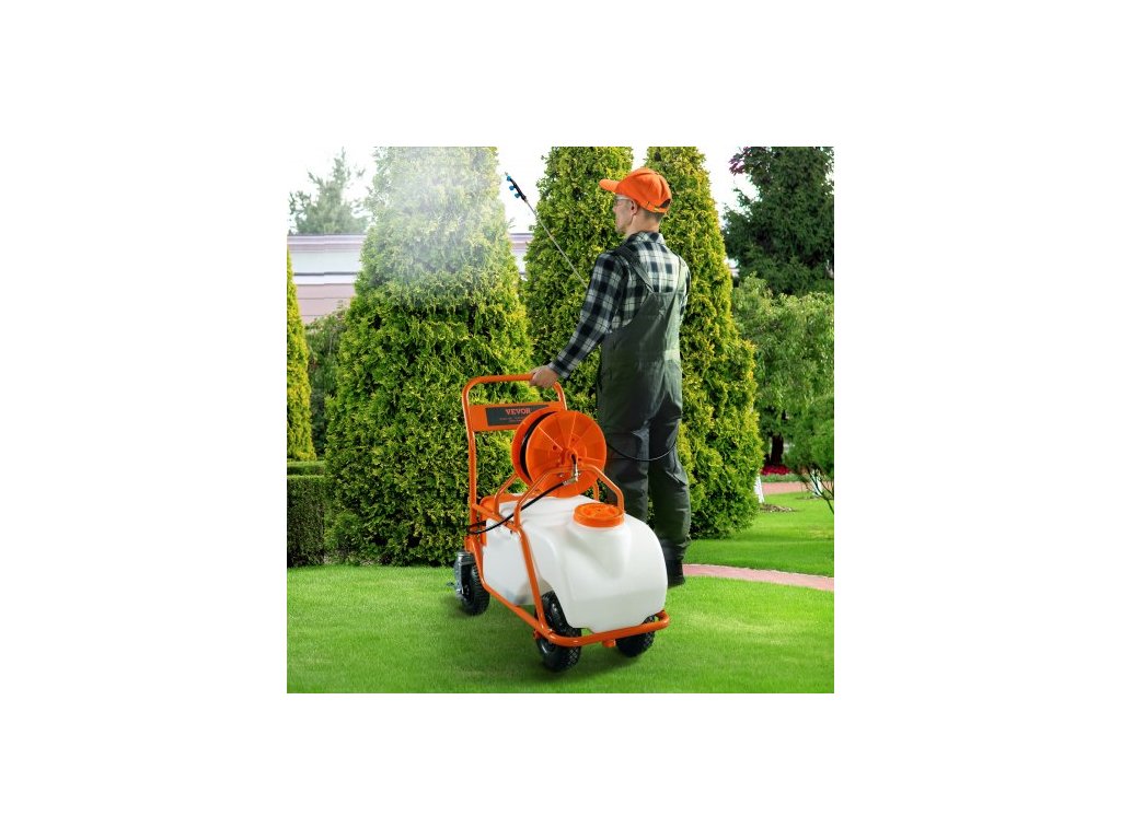 Trávníkový postřikovač s kolečky, nastavitelný tlak 0-90 PSI, postřikovač s nádrží o objemu 60 l, s 8 tryskami, 2 tyčemi, širokým otevíráním víka pro zahradu, pletí, postřikování