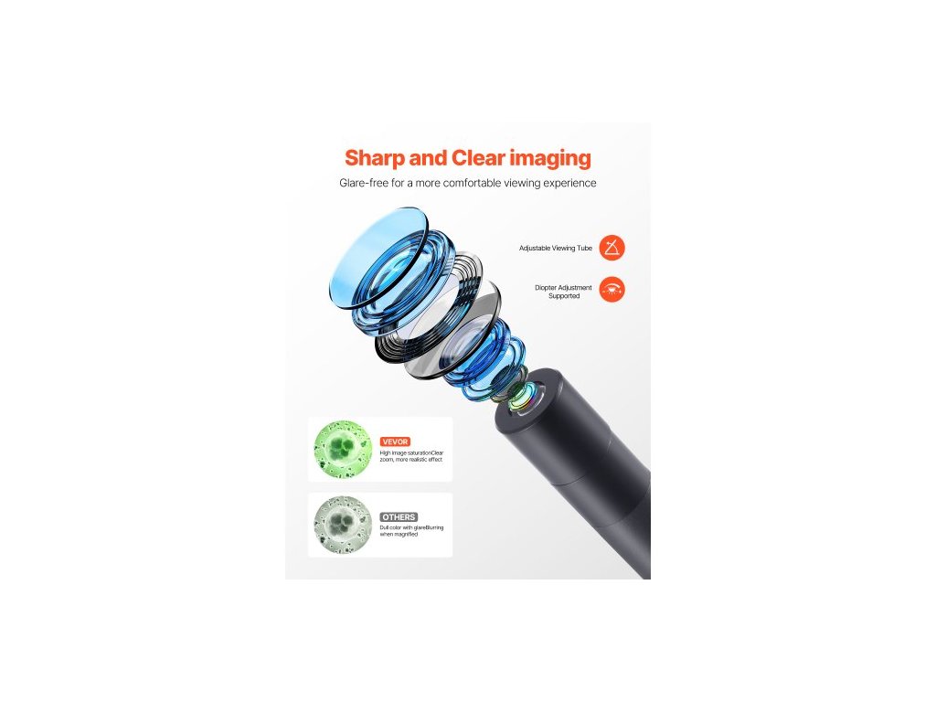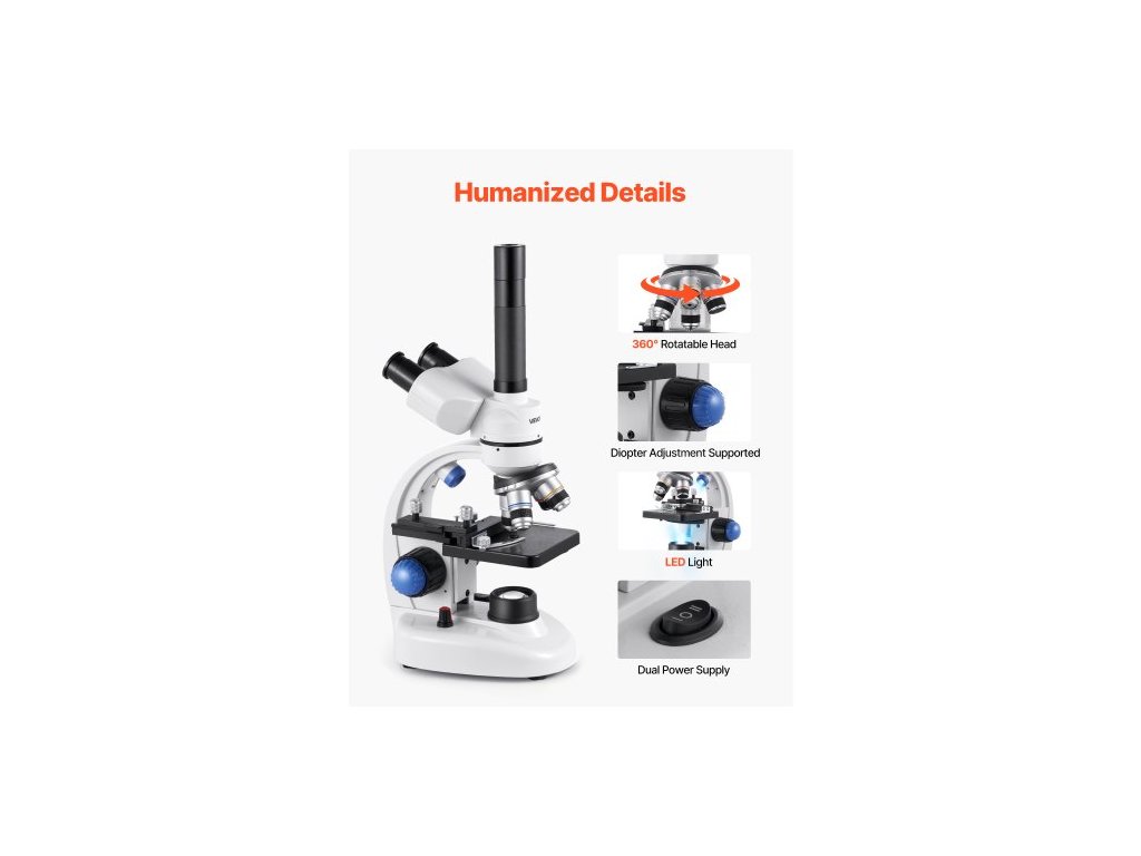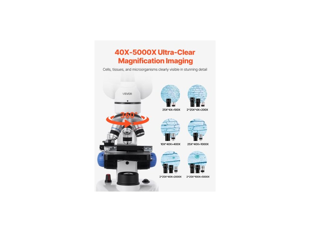 Celkové zvětšení: 40X, 100X, 250X, 400X, 1000X, 2000X, 2500X, 4000X, 5000X, Zdroj světla: LED lampa, Rozměry výrobku: 5,5 x 7,5 x 13,3 palce / 140 x 190 x 338 mm, Napájecí adaptér: Standardní zástrčka EU, Výstup: DC 5V/2A, Kabel Délka: 1000 mm, Elektronický okulár: 1,5 megapixelů, Hlavní materiály: Základna: Hliníková slitina; Tělo: Hliníková slitina + ABS plast, Specifikace: Trinokulární, zvětšení 40–5000x, Kondenzor: Nastavitelná clona, Rozsah zvětšení: 2 sady okulárů: 2x, 10x, 25x; Objektivy: 4X, 10X, 40X, 100X, Zaostřování: Přesné zaostřování, hrubé (18 mm), ultrajemné (1,2 mm) nastavení, Hledačka: 3 tubusy, otočná o 360°, Napájení: Napájeno adaptérem, Číslo modelu: H-33A, Stolek: 95 x 95 mm, Mechanický stolek s rozsahem pohybu 70 x 40 mm, Parametry napájení: Vstup: AC 110–240 V, 50/60 Hz, Čistá hmotnost: 2,22 kg ±5 % (včetně veškerého příslušenství)