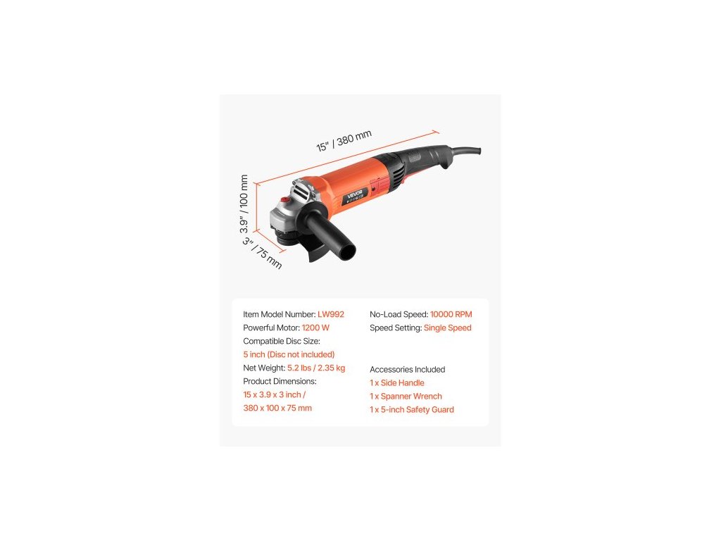Výkonný motor: 1200 W,Kompatibilní velikost kotouče: 5 palců (kotouč není součástí balení),Nastavení rychlosti: Jedna rychlost,Číslo modelu položky: LW992,Otáčky bez zatížení: 10 000 ot./min.,Rozměry výrobku: 15 x 3,9 x 3 palce / 380 x 100 x 75 mm,Čistá hmotnost: 5,2 lbs / 2,35 kg