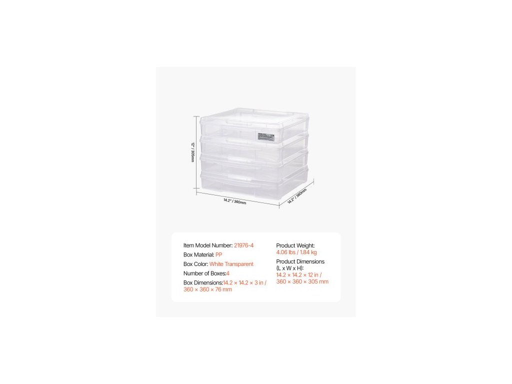 Materiál krabičky: PP,Číslo modelu položky: 21976-4,Hmotnost výrobku: 4,06 lbs / 1,84 kg,Počet krabiček: 4,Rozměry výrobku (D x Š x V): 14,2 x 14,2 x 12 palců / 360 x 360 x 305 mm,Barva krabičky: Bílá,Průhledná,Rozměry krabičky: 14,2 x 14,2 x 3 palce / 360 x 360 x 76 mm