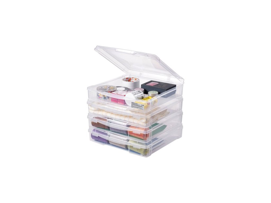 úložný box na papír do scrapbooku, balení 4 stohovatelných plastových krabiček na deskové hry, průhledné víceúčelové pouzdro na dokumenty se zaoblenými rohy a dvojitými západkami, pro kancelářské potřeby, nářadí, umělecké a řemeslné potřeby