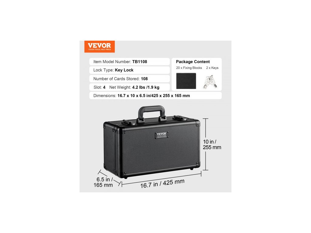 Typ zámku: Klíčový zámek, Počet uložených karet: 108, Číslo modelu položky: TB1108, Slot: 4, Rozměry: 16,7 x 10 x 6,5 palce/425 x 255 x 165 mm, Čistá hmotnost: 4,2 lbs/1,9 kg