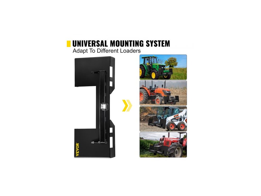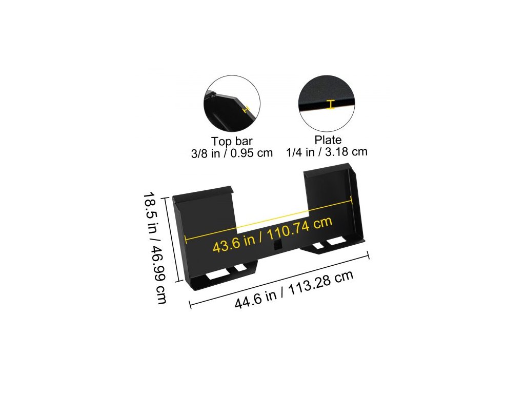 Univerzální montážní deska pro smykem řízené nakladače o tloušťce 1/4" a nosnosti 3000 liber. Rychloupínací montážní deska, ocelový adaptér pro nakladač. Snadno se svařuje nebo šroubuje k různým příslušenstvím. Černá ocelová deska 1/4" a nosnost 3000 liber. Univerzální montážní systém. Snadné svařování. Snadná instalace. Rozsáhlé použití. Barva: Černá. Model: ANZB-HS14. Tloušťka horní tyče: 1/4"; 0,64 cm. Tloušťka desky: 1/4"; 0,64 cm. Materiál: Legovaná ocel. Vnější šířka: 44,6" / 113,3 cm. Výška: 18,5" / 47 cm. Hmotnost: 63,5 liber / 28,8 kg. Vnitřní šířka: 43,6" / 110,7 cm.