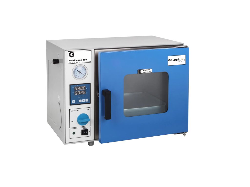 Vakuová sušárna značky GOLDBRUNN 450 byla vyvinuta speciálně pro profesionální použití ve výzkumných ústavech a laboratořích továren a univerzit. Tato spolehlivá vakuová sušárna je vhodná pro šetrné a kontrolované zahřívání a sušení látek citlivých na teplo a kyslík, jako jsou elektronické součástky a granuláty. Velkokapacitní sušárna je navíc ideální pro dezinfekci a sterilizaci různých skleněných nádob.