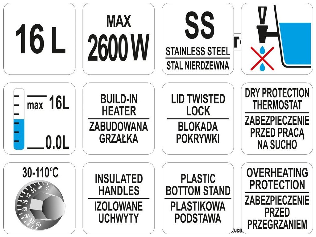 Varník je určen k rychlému vaření velkého množství vody pro přípravu kávy, čaje nebo instantních nápojů. Varník YATO je vyroben z nejkvalitnější nerezové oceli, leštěné do vysokého lesku, díky čemuž vypadá velmi elegantně v hotelech, konferenčních místnostech nebo restauracích.