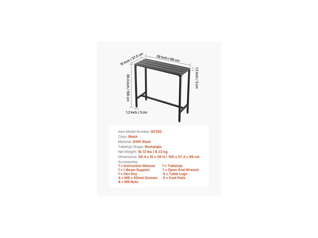 Tvar desky stolu: Čtvercový,Barva: Černá,Číslo modelu položky: BZ100,Rozměry: 39,4 x 15 x 39 palců / 1000 x 375 x 980 mm,Materiál: Ocel Q195,Čistá hmotnost: 18,12 lbs / 8,22 kg