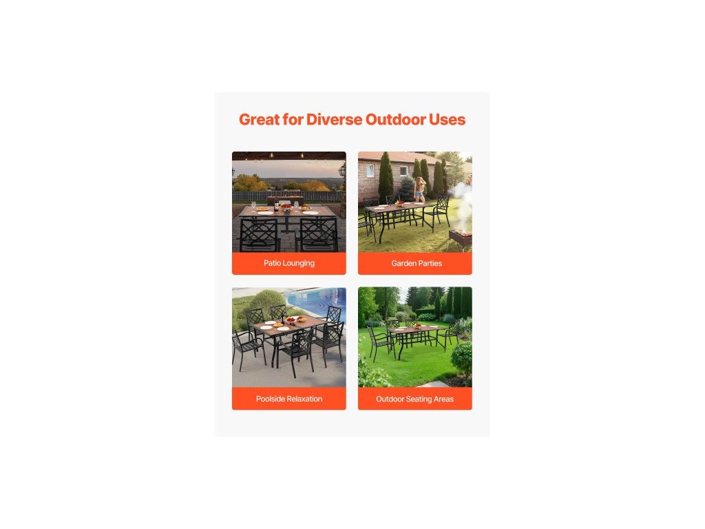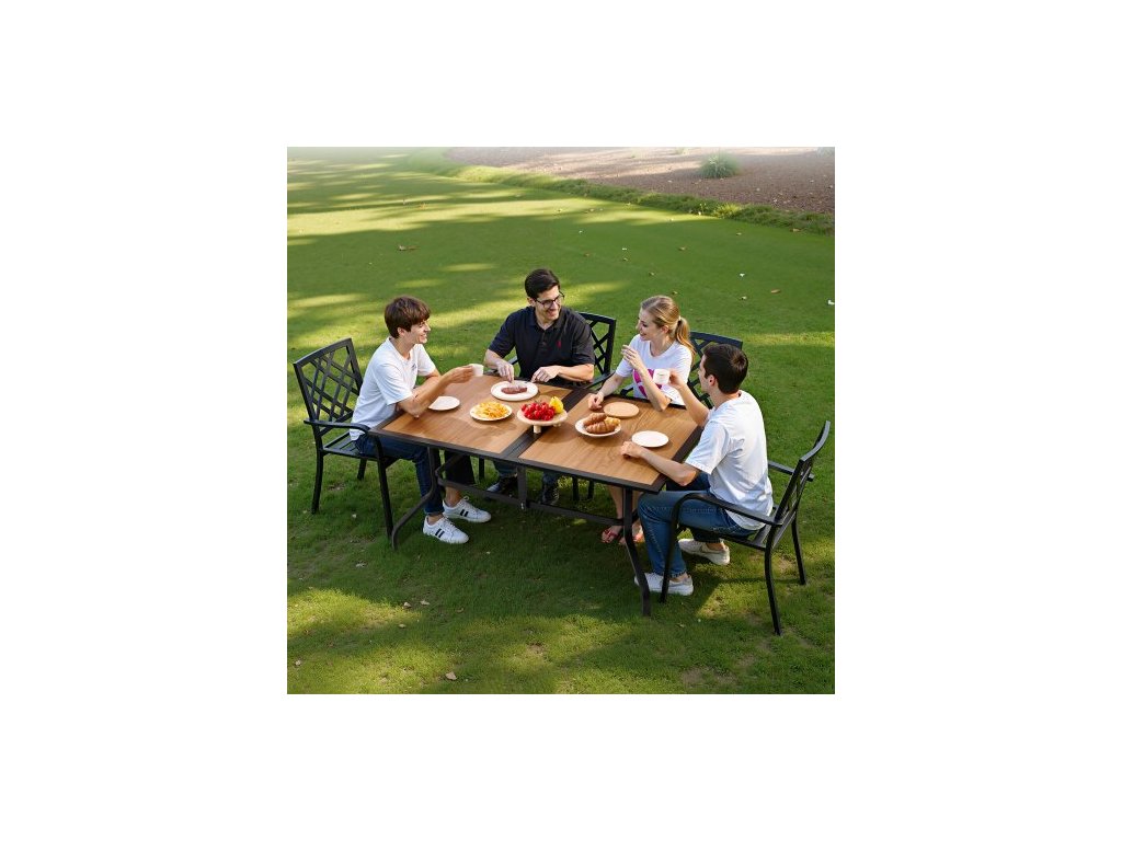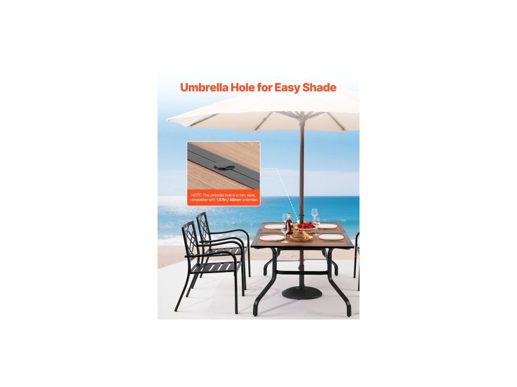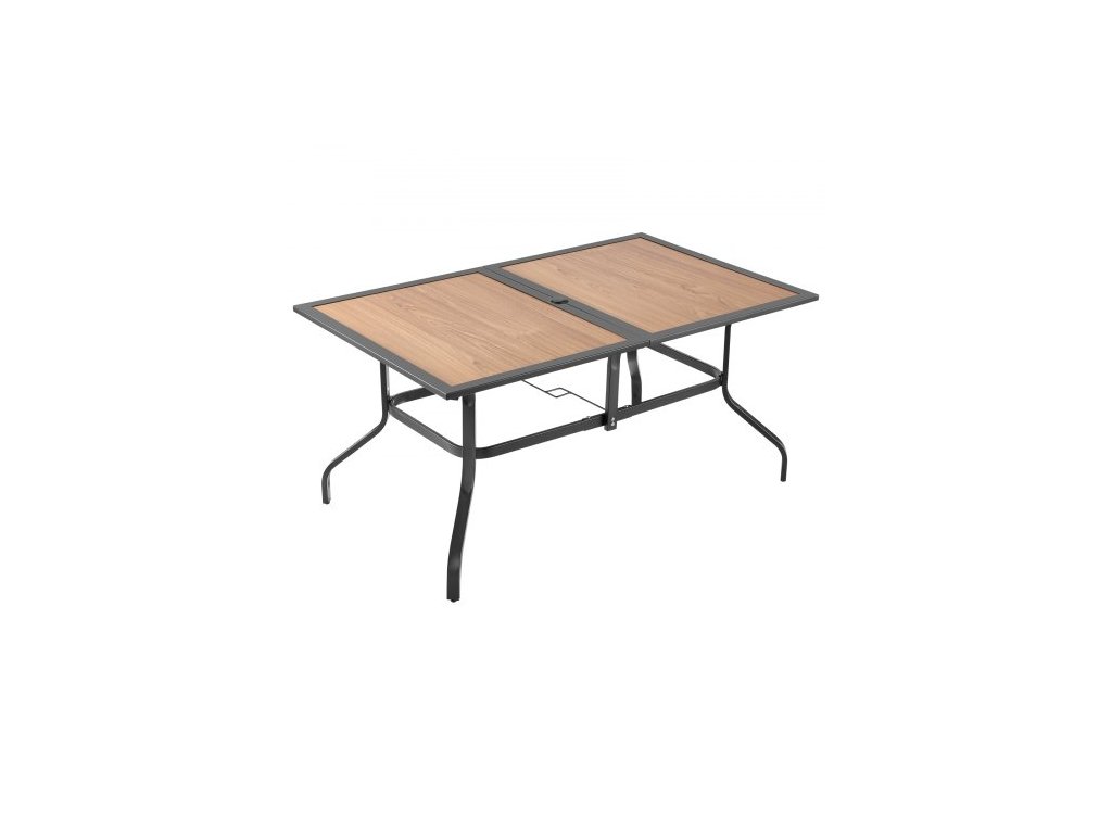 Venkovní jídelní stůl na terasu, 150 cm dlouhý, obdélníkový, dřevěný, ocelový, lamelový, bistro stolek na zahradu pro 4-6 osob, s otvorem pro slunečník 38 mm, velký nábytek do každého počasí na zahradní verandu, hnědý